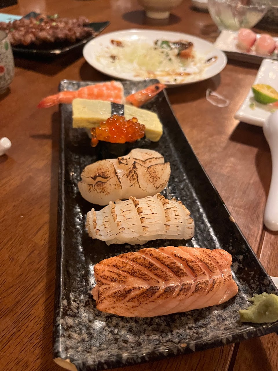 這次點的是綜合生魚片,炙鮭魚握壽司,酒蒸文蛤跟烤莎朗牛排,生魚片跟文蛤很新鮮好吃,炙燒的口感超讚?
