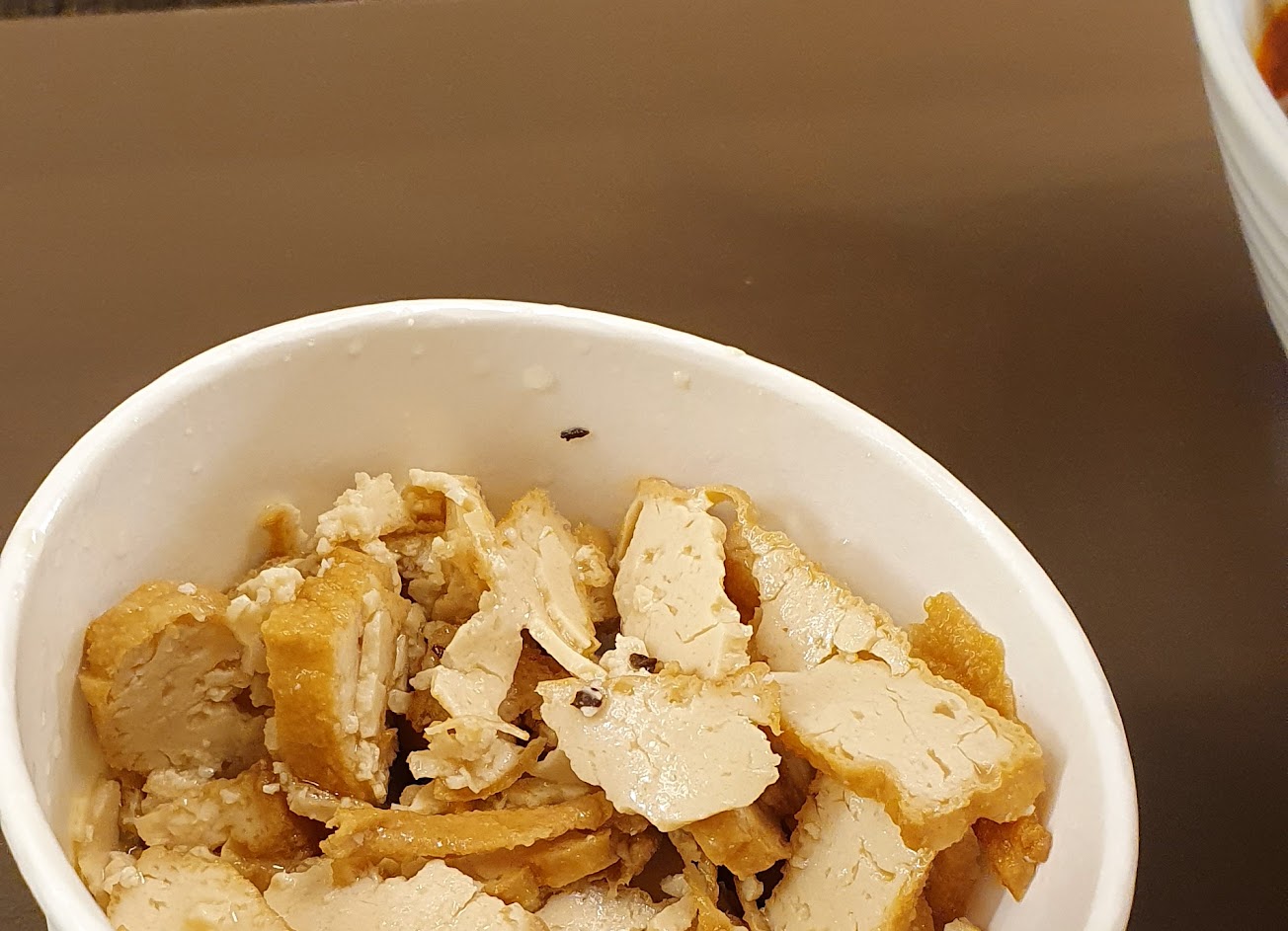 東西不算難吃,但也稱不上好吃,麻辣牛肉拉麵,牛肉是火鍋肉片那種肉,湯的味道沒有進到豆腐裡頭,鴨血中心還是冷的,湯的味道不錯,但喝不到牛肉味,不像一道餐點,比較像食材的集合。
