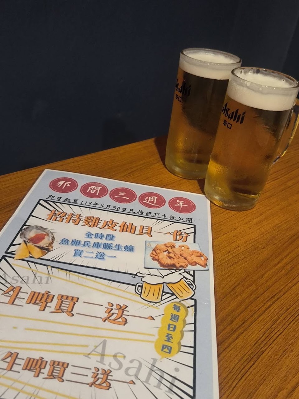 點了肉串、酒蒸蛤蜊、烤飯糰、生啤
