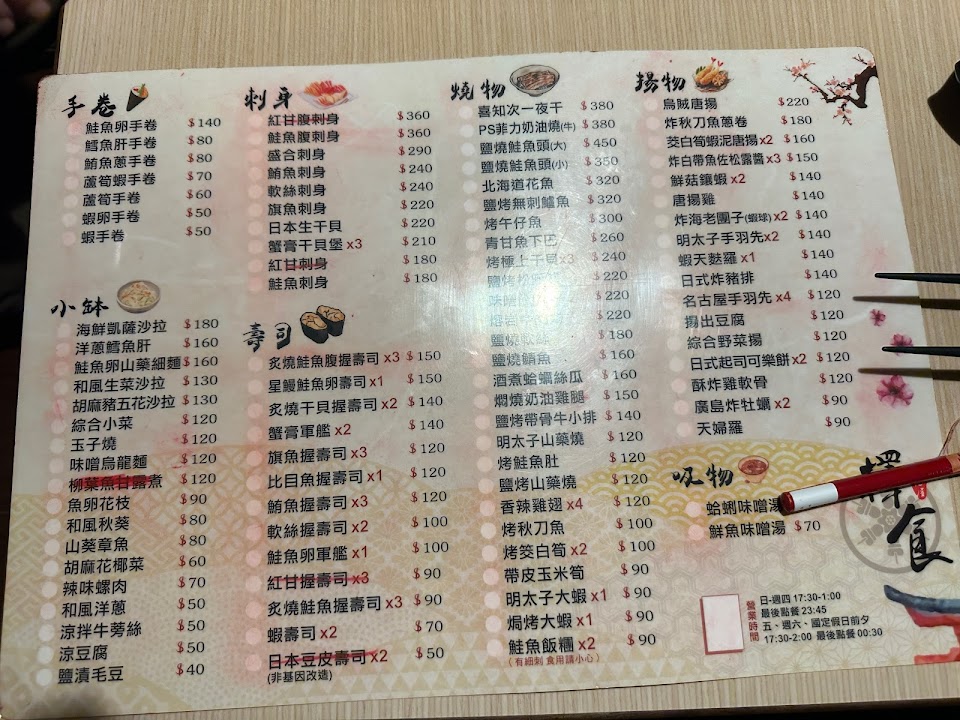 星期四晚上與太太一起去用餐,點了些烤魚跟黑鮪魚生魚片!不知道是廚師不用心還是對食材不熟悉,上來的黑鮪魚生魚片筋硬的咬不斷,當下馬上跟餐廳反應,雖然後來沒有算費用,心理對生魚片確蒙上一層陰影。希望廚師能對食材多多用心,生魚片魚肉熟成的時間、魚的那些部位筋膜較多,應該幫消費者事先去除,都應該是廚師的專業,而不是囫圇吞棗的上菜了事而已!