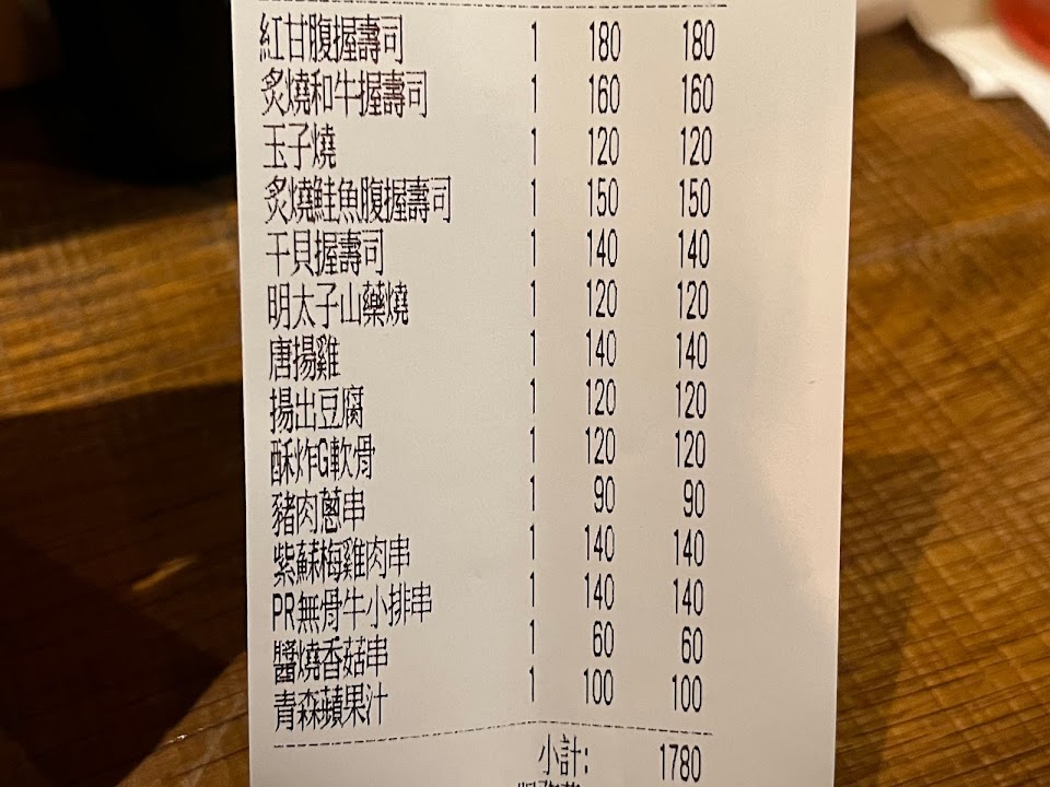 烤物都偏油,雞肉有點腥味,雞皮蠻厚的,個人偏向烤到薄脆的雞皮,炸手羽先好吃??豬肉有點乾不建議點,鮭魚頭油脂豐富不介意價格的可以點,餐點份量都蠻大的,cp值高,但不會想回訪