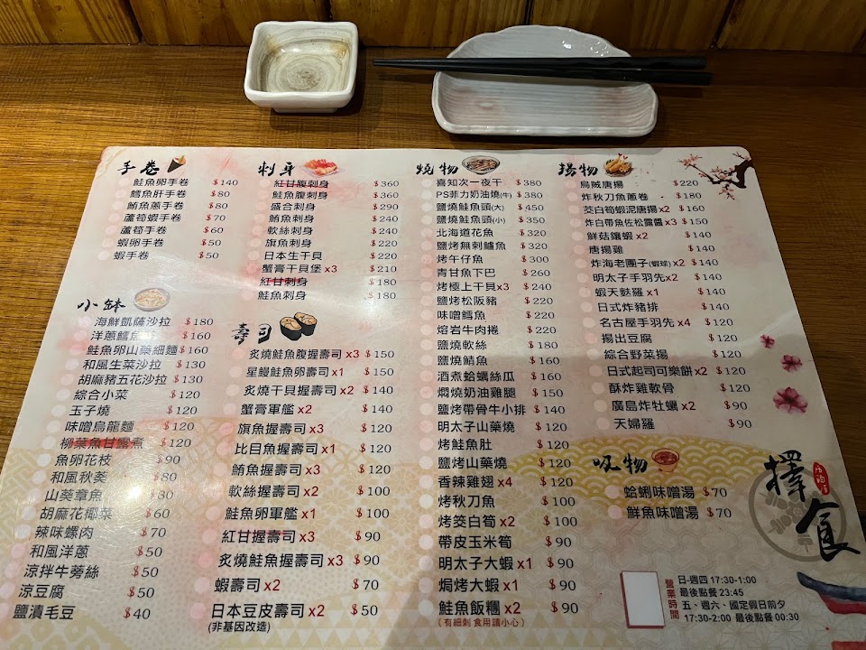 從黑燈瞎火的仁愛市場,一彎進擇食的巷子,彷彿進入另一個世界,滿滿的溫暖燈籠,這就告訴我們找對地方啦。 生意超級好,店裡坐滿了人,一下子外面也就有人排隊,不過看起來等待時間不用很久即可入座。 今天點了 *鮪魚握壽司 *蛤蜊味噌湯:蛤蜊超多,湯頭味道也很棒 *生魚片:生魚片又大又厚,重點是超新鮮,連不太吃生魚片的我,都忍不住多吃了幾塊。 *炸雞翅:酥脆多汁推薦 *烤物們(烤物真的超級推薦,非常好吃) 牛肉包金針菇(吃過很多家,這家味道最好) 培根捲干貝(蹦出新滋味超棒) 烤櫛瓜(上面有灑七味粉,微辣清爽) 烤牛肋條(牛肉很嫩) *烤鮭魚肚:脆脆的皮加上軟嫩的魚肉,還有滿滿的魚油,超好吃有不膩口