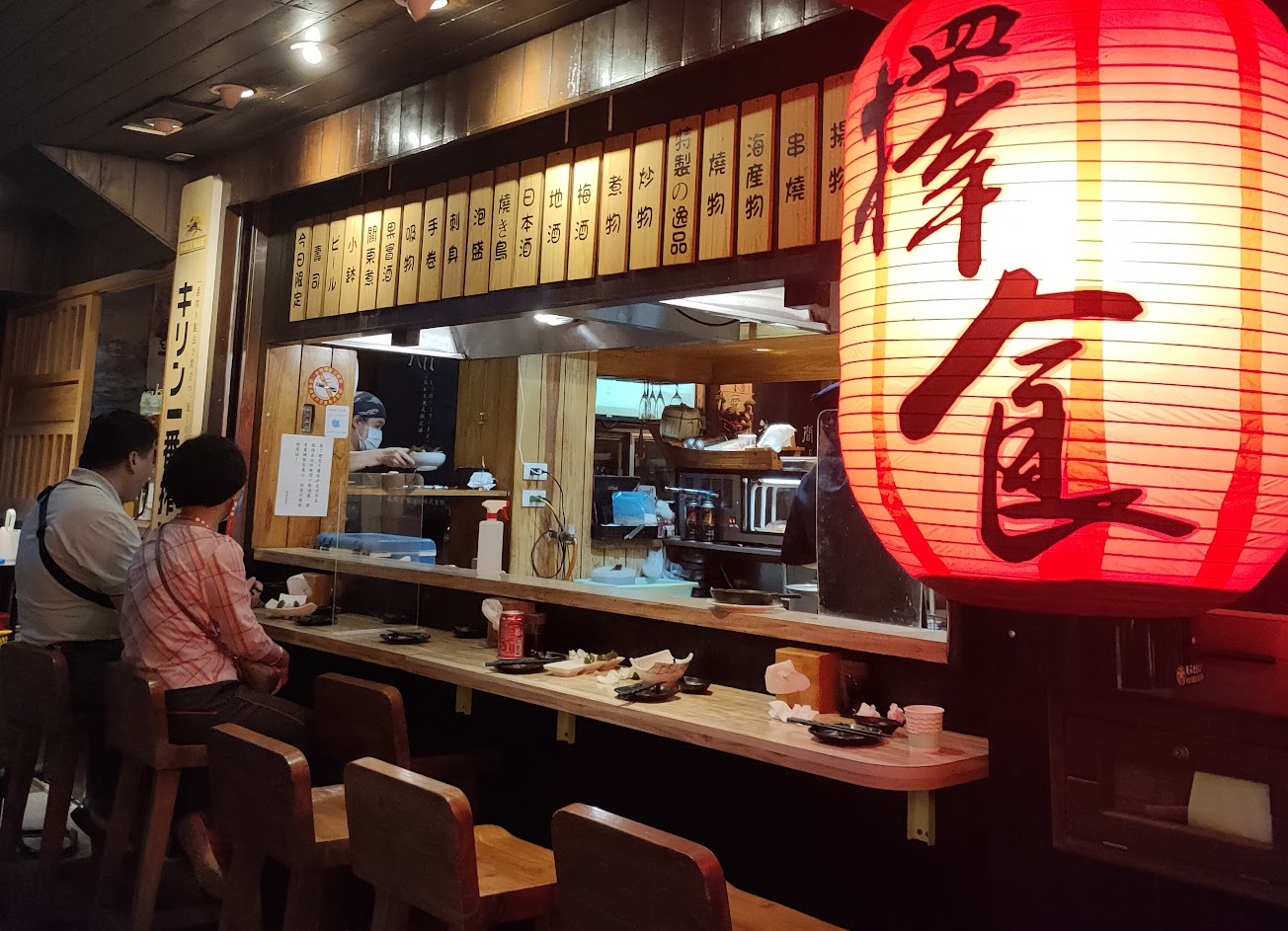 或許是太認真研究網評過度期待了,現場吃真的蠻失望的,不過這家店的裝潢還是有特色的,店內沒有一般桌位,吧台位置非常小,所以空間很擁擠,上菜沒有在管時間分配,再加上防疫的關係有放上一隔板,所以上菜後,桌面的空間嚴重不足。 服務態度上給人普通偏冷淡的感覺,就是那種說話都不會不禮貌,但就是沒有笑容,很制式的感覺,吧台的師傅臉色很差,缺乏了居酒屋的那種溫馨問候與招呼感,天氣很冷,鍋物卻限定只有事先預訂包廂的客人能夠點餐,讓客人感覺有種自己像是次等公民般的感受。 餐點方面,生魚片握壽司非常普通,炙燒握壽司和干貝蟹膏堡師傅都炙得有點過頭,烤的過黑過乾了,感覺有點浪費了食材。最可怕的是令人期待的唐揚炸雞,第一次吃到白色的炸雞,沒有唐揚的金黃色也毫無香氣,最糟糕的是還炸過頭,整份炸得太乾連雞皮都乾掉,內部完全沒有雞汁,也沒有炸雞應有的油脂和Q彈口感,像這樣最基礎的日式餐點,也能做成這樣真的令人無言。 其他的炒物與熱食比較好吃一點,熱呼呼的烏龍麵口感蠻好的,還有清淡的絲瓜蛤蜊也還不錯,但是身為居酒屋,餐點不好吃是其次,失去了精神的招呼與人情冷暖,就可惜了整家店的裝潢氣氛。