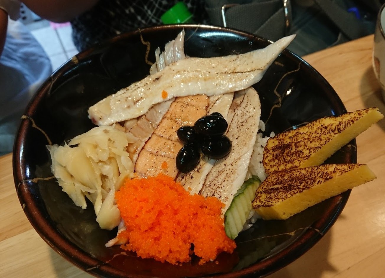 點了綜合炙燒生魚丼,擺盤很用心,;有小黃瓜,魚卵,玉子燒,甜黑豆等做點綴,色香味具全, 主角魚肉炙燒的恰到好處,醋飯不酸很爽口….