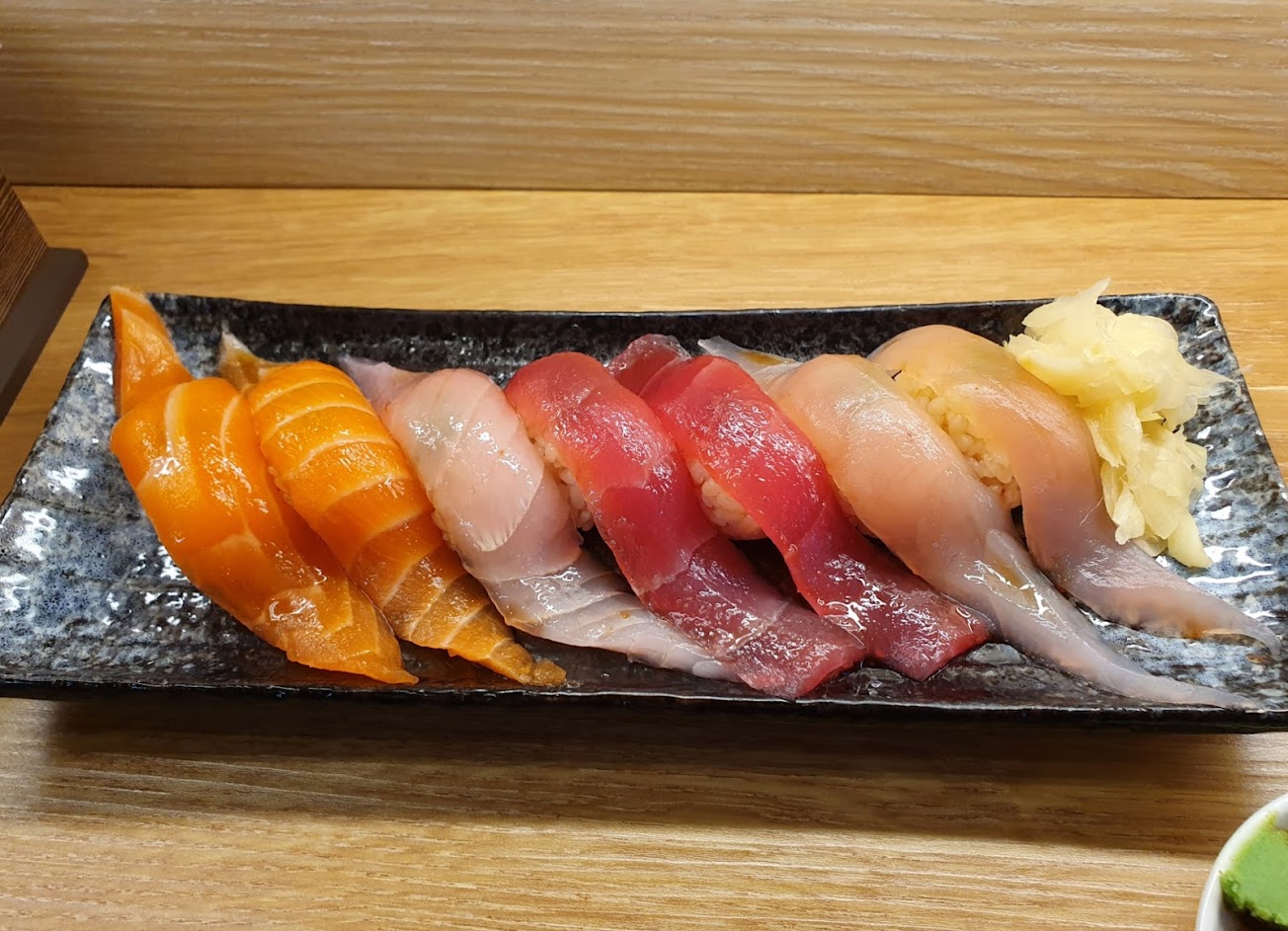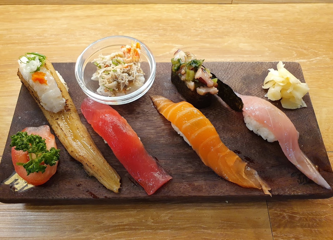 有常備菜單和小黑板當日菜單,店員會另外附上芥末與醬油小碟,長條的壽司是日本關西式風格,這次點套餐A: 1️⃣鮭魚卵及海膽(小份量在玻璃小缽) 2️⃣干貝(新鮮柔軟的口感) 3️⃣明太子玉子燒(玉子燒中間擠一條明太子,再炙燒過) 4️⃣鮪魚握壽司、5️⃣鮭魚握壽司、6️⃣海麗握壽司