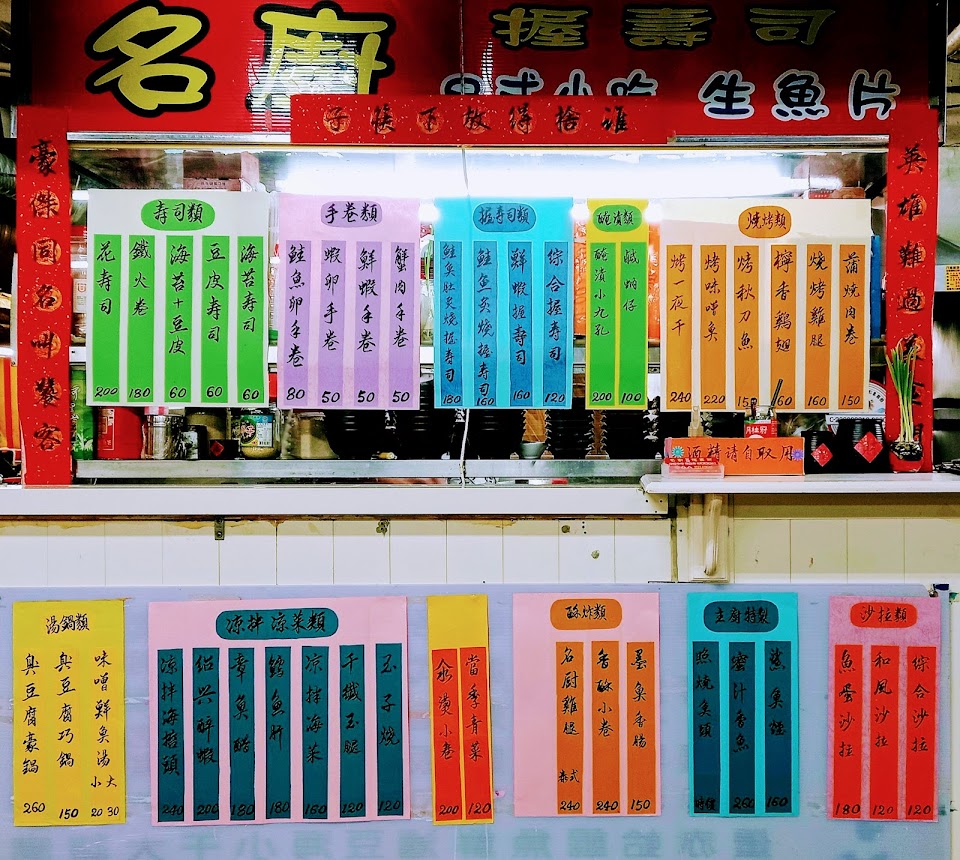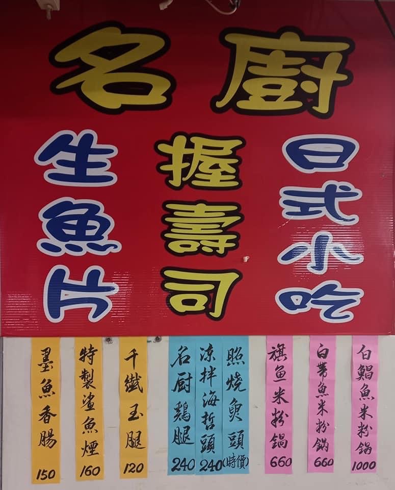 2020 9 19 去新北完了一天回來不知道吃什麼,沒有特別想吃太多,看到這間握壽司想來喝個味噌湯配生魚片,這間小攤位位在成功市場地下一樓美食街內,走了一圈發現幾乎都是海鮮熱炒的也有一家賣牛排鐵板燒,剛來名廚時都沒有人,點了兩碗味噌湯、一盤200生魚片,還有300的不過沒點,烤味噌魚及墨魚香腸,店家還招待了醃蘿蔔乾,先上的是生魚片軟度還可以,新顯度普通,基本的鮭魚鮪魚還有一種不知道,墨魚香腸外皮微焦,內部軟Q有嚼勁另外有完整的墨魚香氣在嘴裡散發出來,味噌裡的鮭魚片很軟嫩,豆腐是用板豆腐,除了鮭魚裡面還有另一種魚肉質較結實,不知道是不是昂鋼(台語發音),味噌魚肉質嫩,味噌融入進去不會過鹹,魚應該是用油魚去烤的