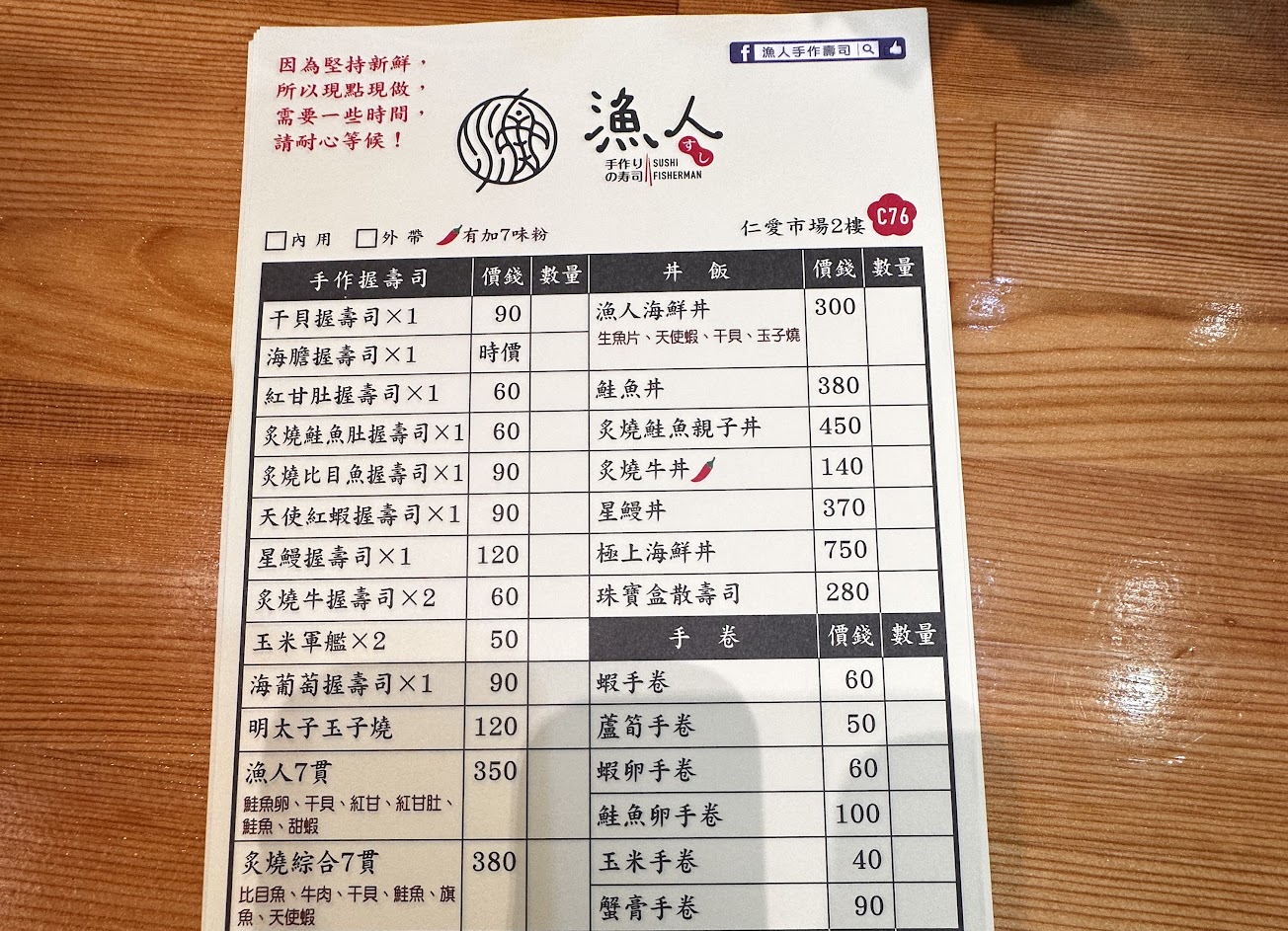 基隆仁愛市場二樓有許多生魚片、握壽司的專賣店,每家都各有人喜好,當中這家漁人手作壽司也是許多人推薦。