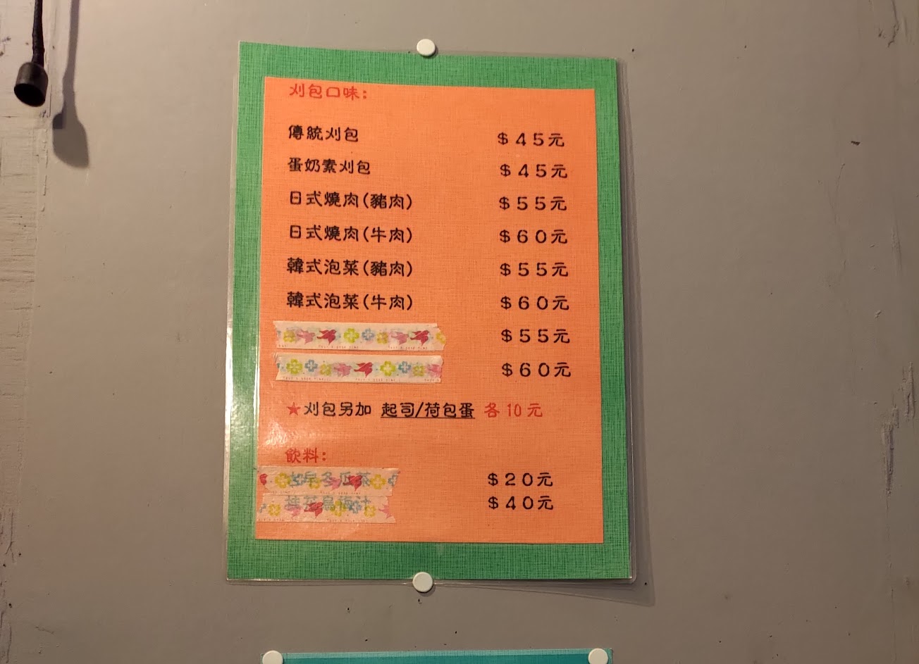 走過路過 居然有大明星在門口獻唱 歌聲非常的優{迷人}男者歌曲唱完 還邀現場的人一起為今天火車上事故的人禱告{好善良溫柔的心啊} 仔細一看原來是賣刈包的{口味有好幾種} 老闆{人很客氣}建議買泰式打拋豬 拿到手趁熱邊走邊吃{好吃} 回到家刈包已經冷了 嚐著還是覺得香氣撲鼻 刈包也QQ的 我加了幾滴泰式醬油{有蝦腥味}嗯~ 不錯.覺得更泰 下次路過會想再跟他買原味的看看 對了 我剛剛發現牆上有市長簽名 看似很小的一家店難怪覺得蓬蓽生輝 門口有兩張坐滿客人的桌子 很溫馨