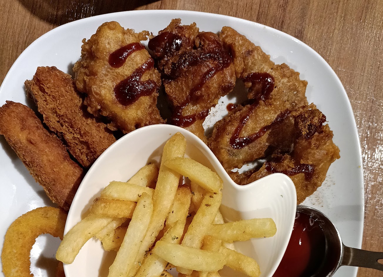 德國豬腳、辣炒小龍蝦麵、薯條挺好吃的 今日用餐是第一次點了雙人分享菜B餐 滿滿的餐點吃的好飽好飽還吃不完,最後要準備走時還發現還有一個餐點漏上了,但由於已經吃不下只好請老闆直接幫我們做成外帶,老闆人很好,服務也很棒