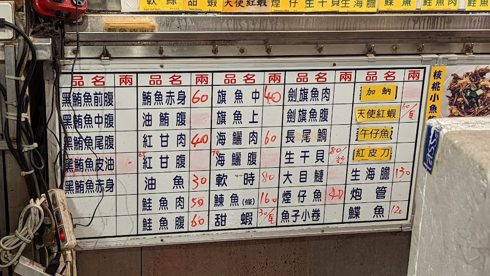 第一次造訪,搞不清楚如何點餐,經工作人員說明後,才知道右邊是排生魚片,左邊是排非生魚片,生魚片現點現切,全部秤重,食材算新鮮,但價格普通,內用是坐在騎樓上用餐,用餐環境不算好,不介意用餐環境又喜歡生魚片的朋友可以來試試