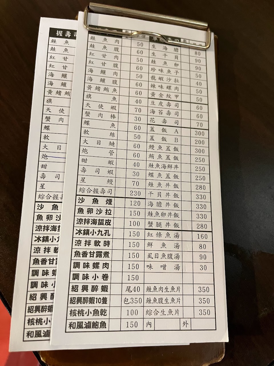 價格的部分,生魚片、握壽司每日的價格都不同。店家會在FB更新。生魚片是以兩計價,握壽司和軍艦壽司是以一貫計價,價目表寫在攤子上的白板。