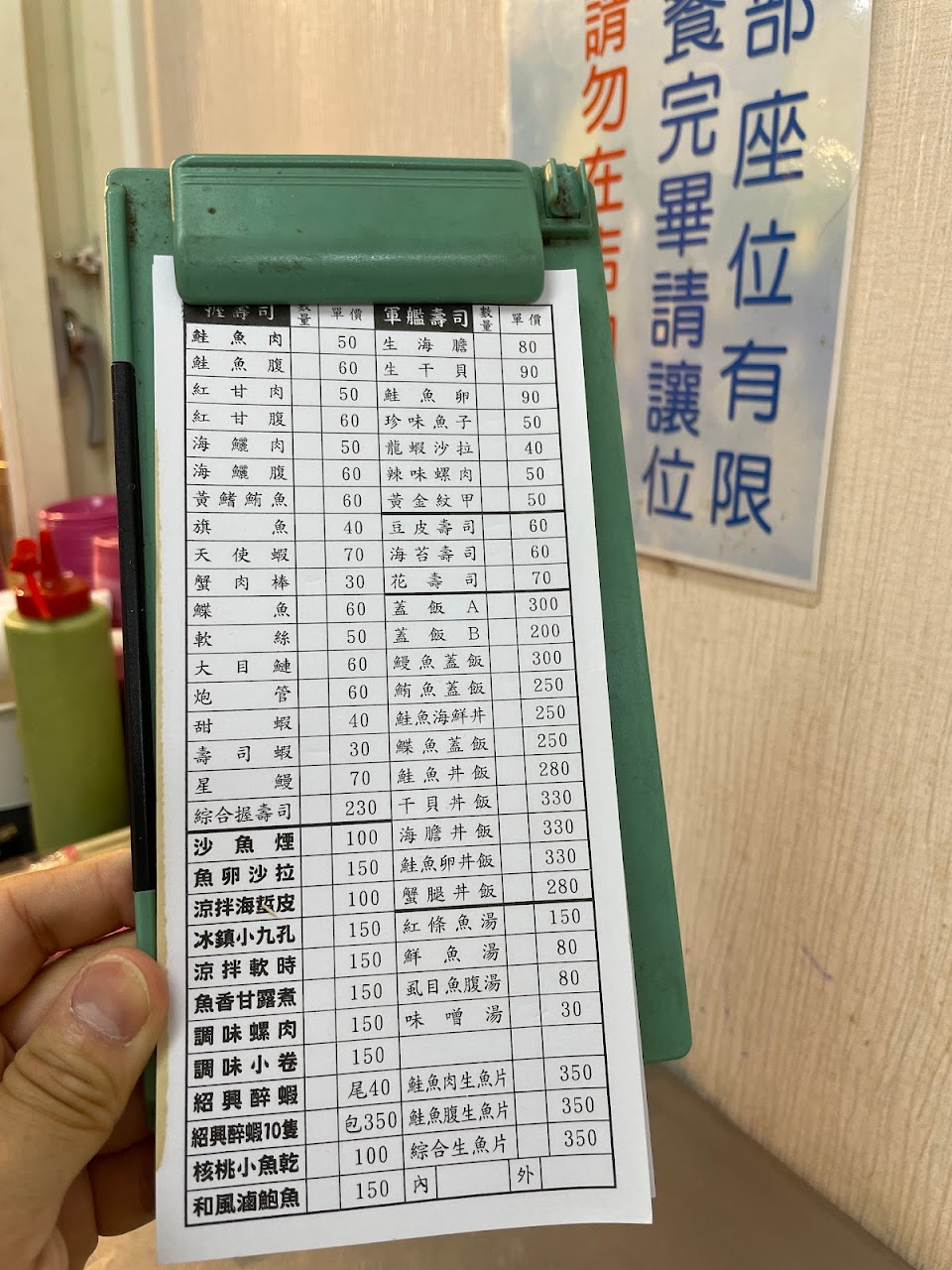 「點生魚片先抽號碼牌,壽司畫單喔~」