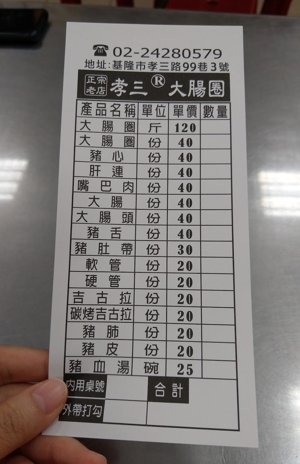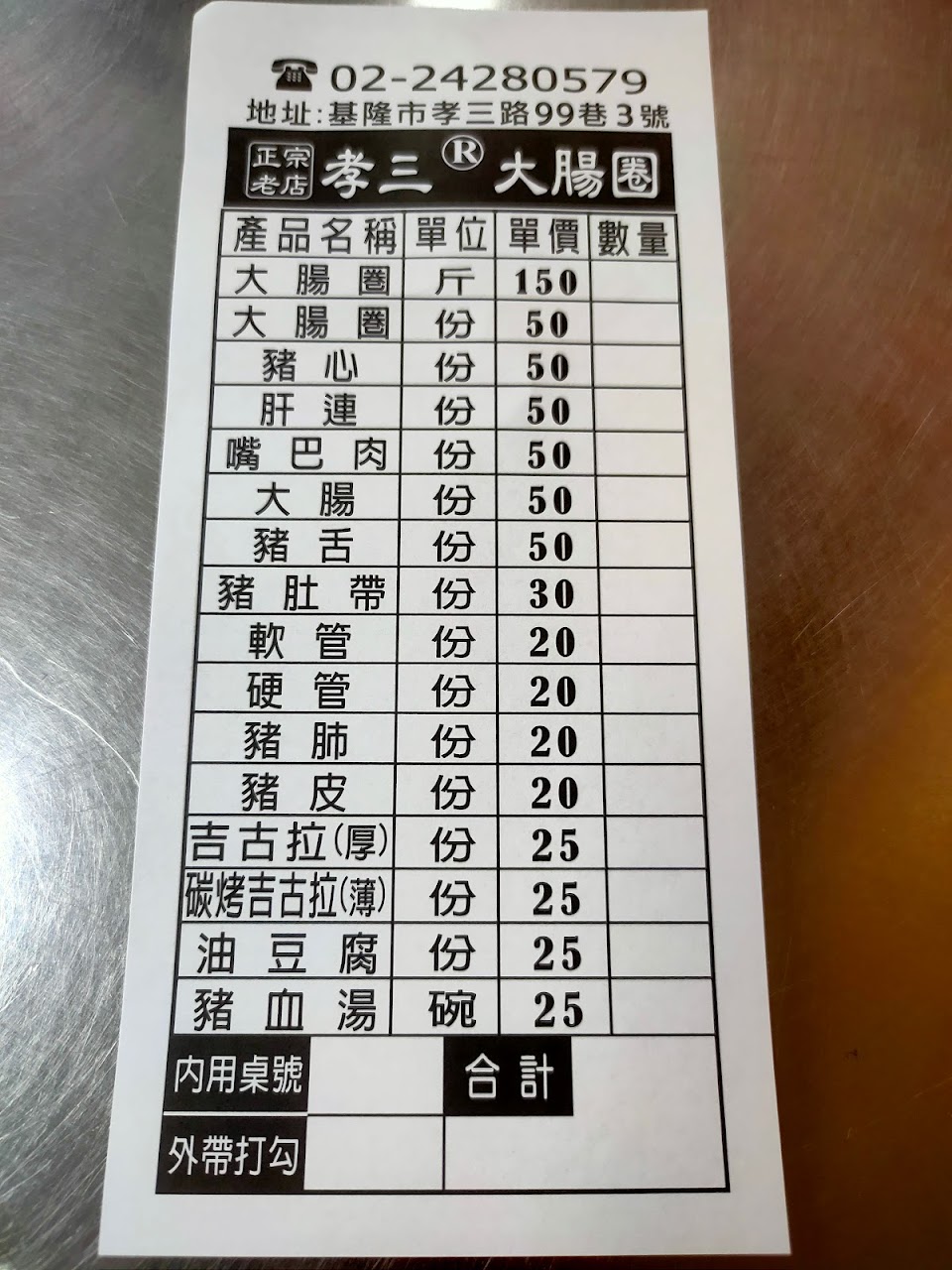 要進基隆車站南站前看到阿國碳烤燒餅在排隊,本來也跟著排的但想想沒地方坐著吃又不方便在外面吃,就另找附近谷歌地圖上評價較高而且評價數也多的:基隆孝三大腸圈。雖然在小巷內但從基隆車站南站斜對面ok超商的巷子走進去就會看到店家的由此進入指示。第ㄧ次來本不知道要點啥,但看到好久沒看到的豬肺,馬上就劃了下去,坐定才發現這是店家招牌,敢吃的必點。 周六快一點半了內用還是要候位,先跟帶位的報人數就會給菜單,上面會手寫號碼,等叫號入座。一個人戰力相當有限除了豬肺只點了豬血湯+大腸圈+吉古拉+天人交戰後選了嘴巴肉。豬血湯的豬血很嫩。吉古拉純粹是沒吃過加上是基隆限定。大腸圈跟所有的黑白切都是原味即便不沾醬都沒有一點豬騷味。個人覺得這是家被大腸圈耽誤的黑白切店。下次要多找幾個人來,點一份大腸圈填肚子然後狂點黑白切。