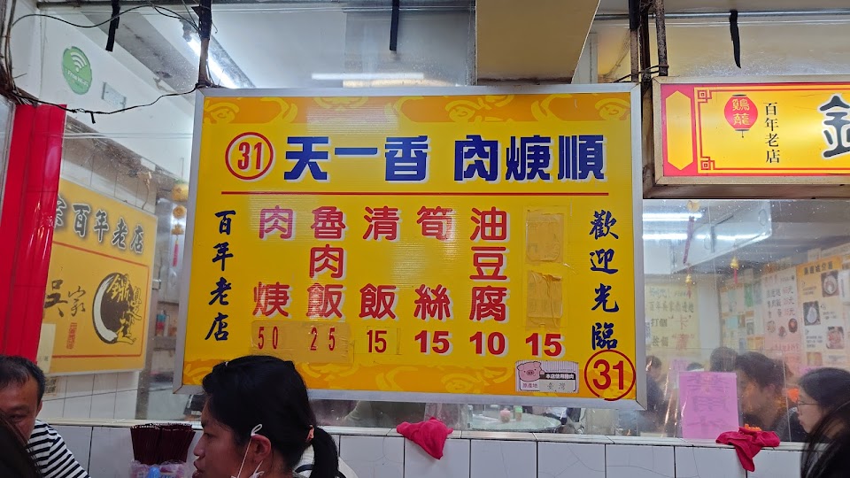 天一香販賣品項極少,只有滷肉飯、肉羹、筍絲及油豆腐,然座位區很多,雖然用餐時間人潮如滔滔江水黃河決提,但翻桌率極快,不必久等。滷肉飯醬汁給的非常大方, 湯湯水水的像是泡飯,是屬於滷肉飯的醬甜派而非鹹香派,採手切肉,非幼仔肉但也吃得出脂肪與肉絲,黏黏甜甜的很好下飯,然米心太硬不彈牙,當是陳年米,是缺憾。