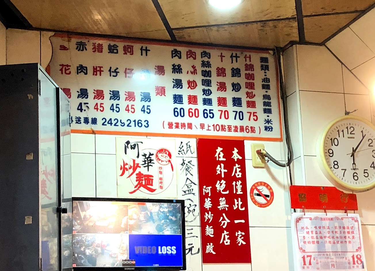 . 台灣 阿華炒麵 咖哩肉絲炒麵 . ?價格:65元 ?交通:交通不太方便,如果你是觀光客,首先你得搭乘火車到基隆,再走一段路,到達夜市才會到達阿華炒麵。 ?店舖:店內位子超級少,通常都需要排隊,附近停車不是太方便,唯一優點是店家從早上十點營業到凌晨六點,讓你隨時想吃都能來。 ?麵食:麵本人為台灣黃油麵,搭配濃厚的台式咖哩,不過吃不太出來麵的味道,整體來說是好吃的,另外一個重點是只要65元。