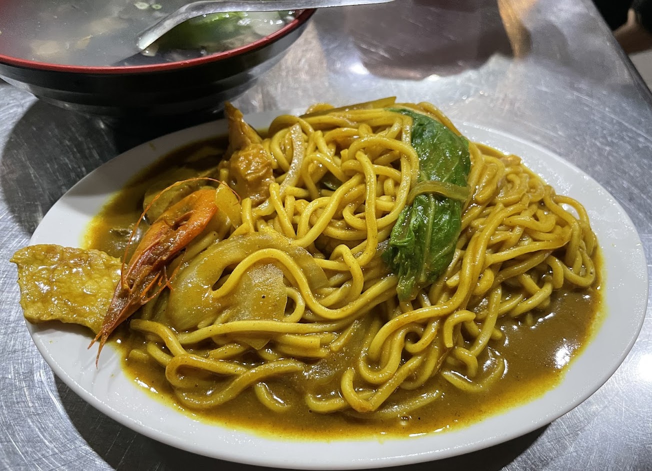 配料與往常一樣沒變,半顆貢丸、豬肝、豬肉、魚板、少許白菜、兩尾劍蝦,獨特的咖喱炒上油麵,麵條表現一般般,重點就是吃那外面吃不到的咖喱味!