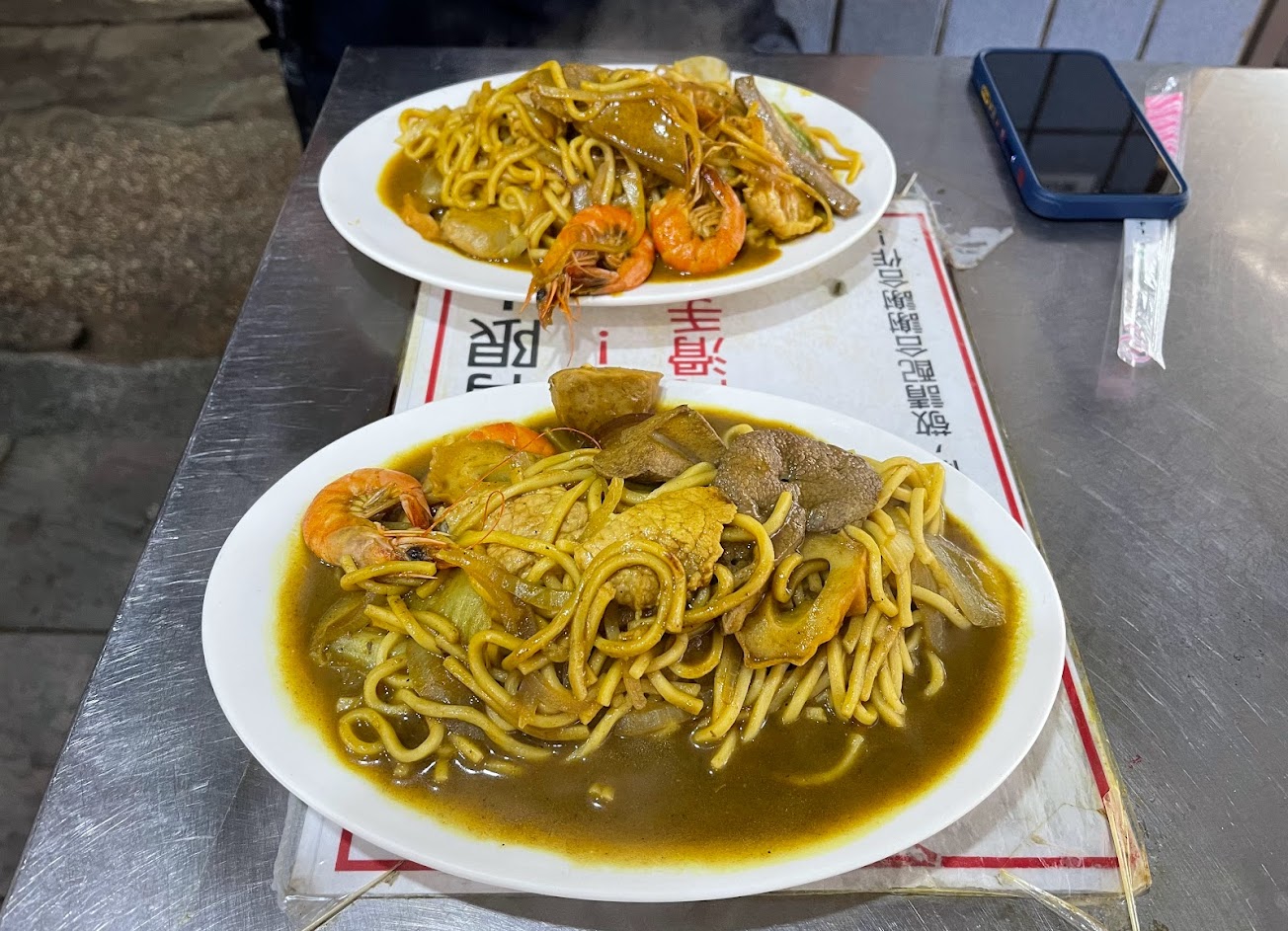 咖喱味非常濃郁的炒麵,味道屬於有點香料型,麵體可以選擇油麵、烏龍、米粉,什錦的配料非常豐富,蝦子貢丸豬肝肉片蛤蜊,位子非常少,但翻桌率算還蠻快,可以吃吃看