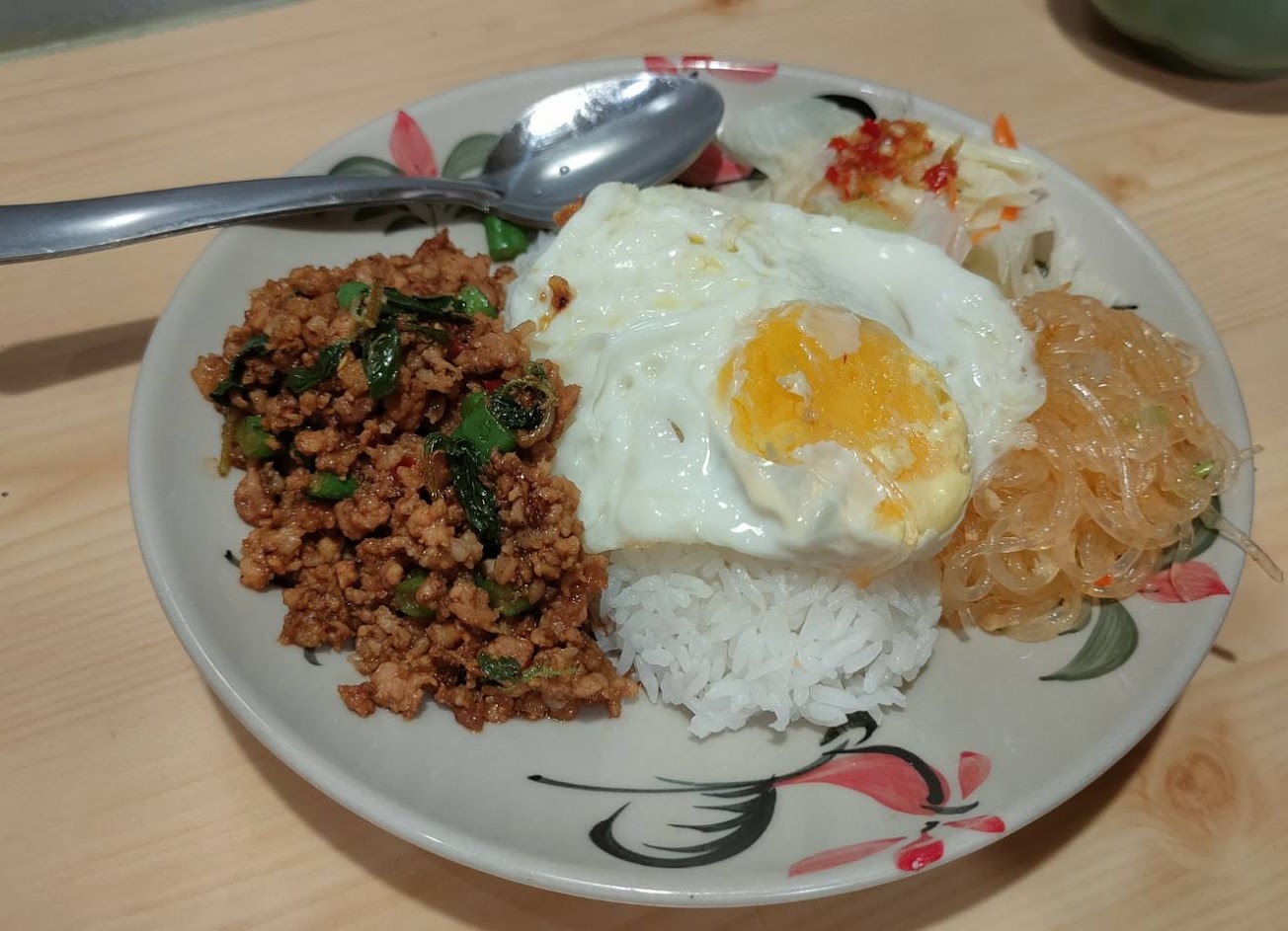 吃不下飯就想買個泰式來吃,以往點的餐點配菜還會有炒高麗菜或木瓜絲,今天收到的配菜卻是完全沒加醬沒調味的生菜這樣外送要110,打拋是一樣好吃啦!但是配菜可以恢復以前的嗎?(照片是已經挖幾口飯所以少些)