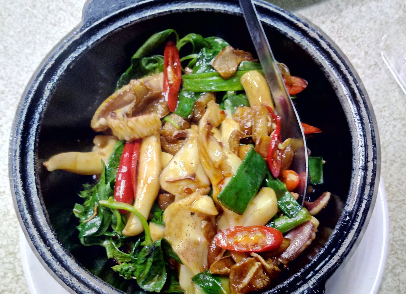 三杯軟絲330:好吃,炒得很香,微辣下飯,軟絲切得蠻大塊,很Q彈