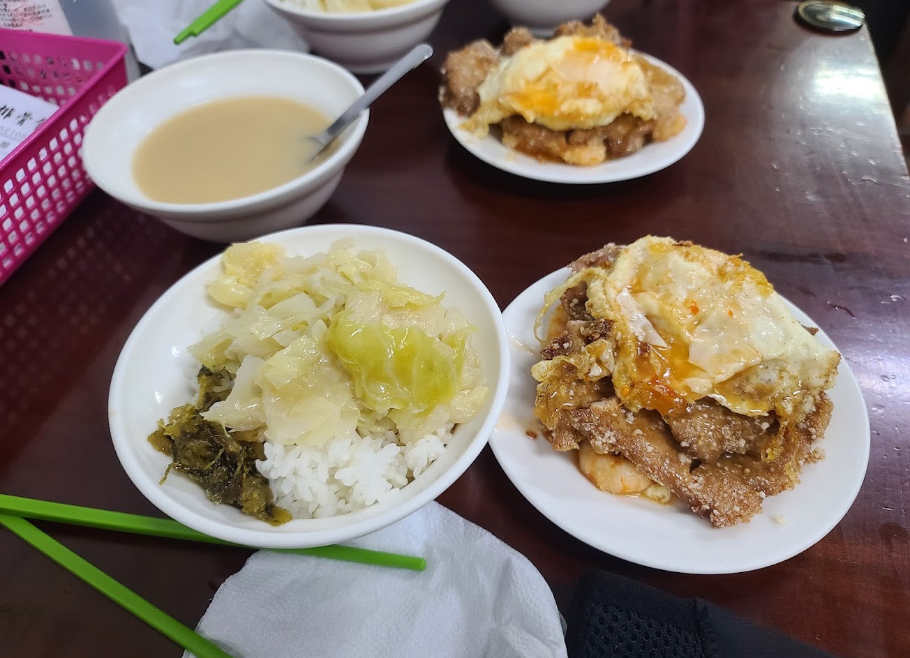 點了排骨加蝦仁/雞腿加魚排/附湯是味增湯和排骨湯。有媽媽味的炸排骨,配菜是白菜魯加酸菜。蝦仁還可以,魚排沒什麼感覺,炸雞腿就還好。價格還可以,就沒什麼配菜。這次去就特地是為了炸蛋去的,但跟自己想的有差距,沒有很炸的炸蛋,好可惜。