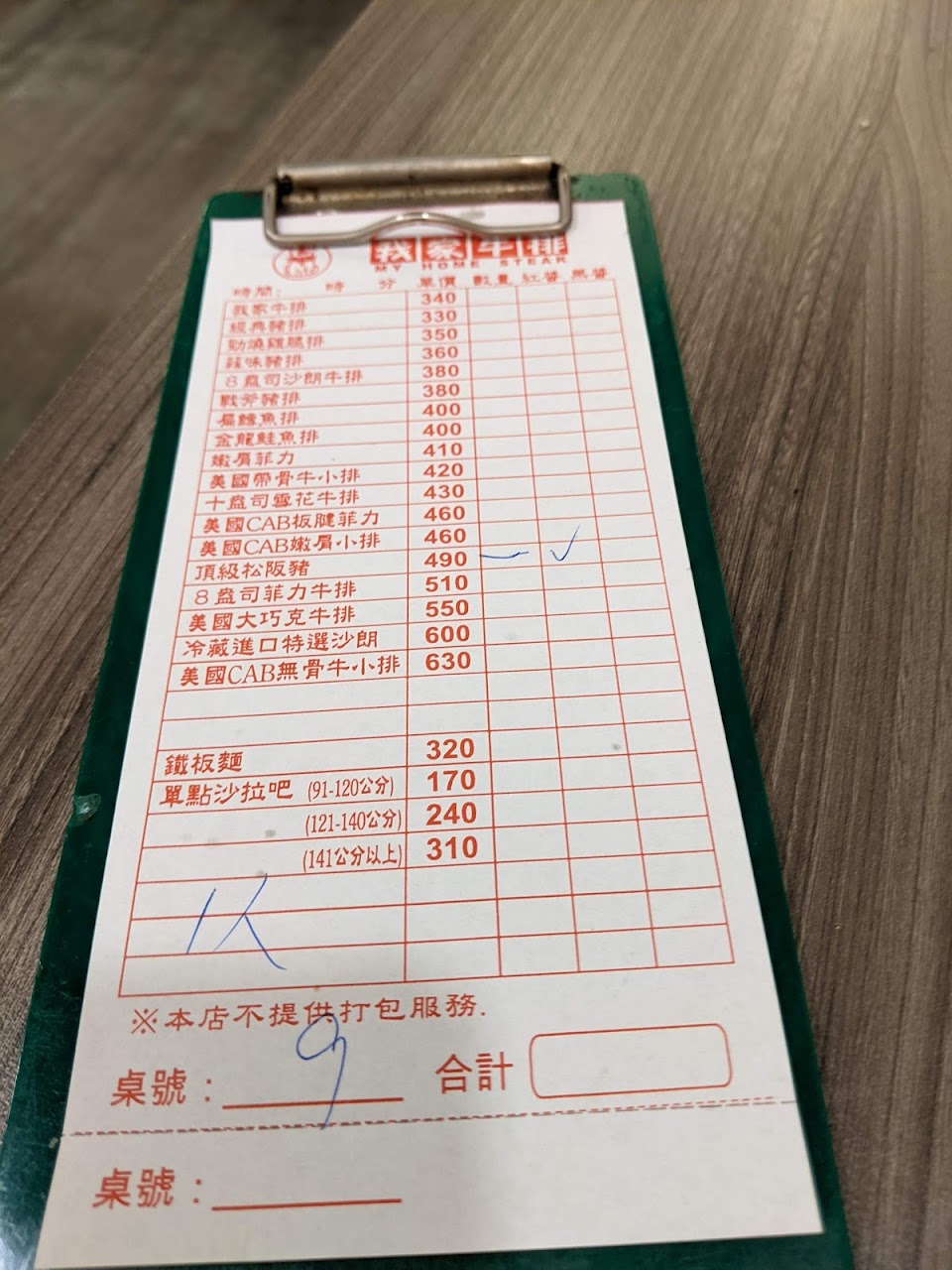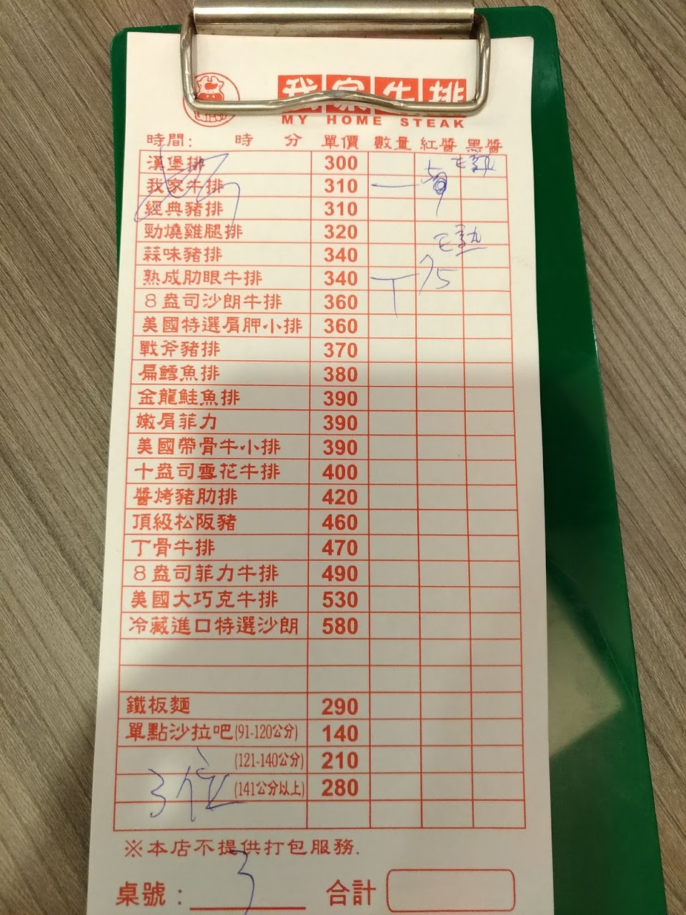我家牛排:是一大塊的牛肉,旁邊配菜是細麵、荷包蛋跟些許三色蔬菜,醬有蘑菇跟黑胡椒可以選,牛排吃起來肉質一般般,不到很可口,但以300多元的消費很可以了。