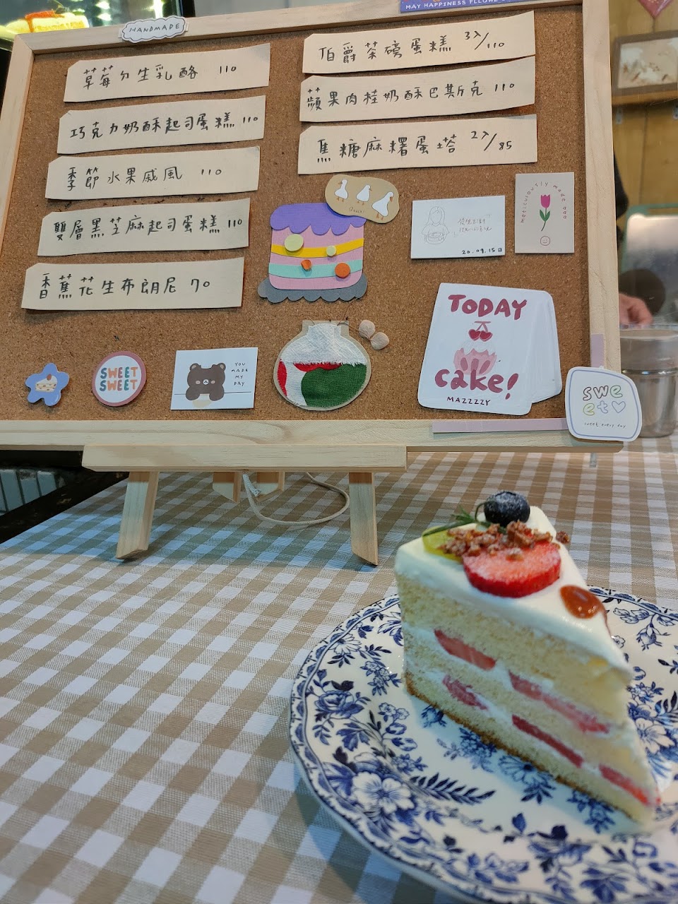 水果戚風蛋糕鬆軟,夾層的慕斯很輕盈,抹茶起司單糕濃郁綿密,就算外帶也很用心擺盤,謝謝。