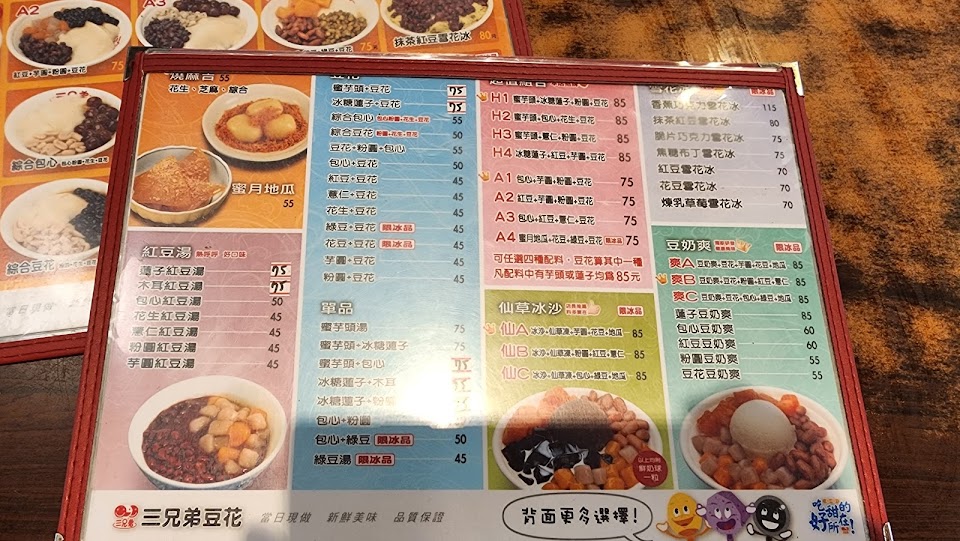 來基隆就是要吃三兄弟豆花,只是疫情過後,基隆夜市也變得冷清,沒有往日人聲鼎沸,磨肩擦腫,攤販店面有好些沒開,難得來一趟,所以我點了最貴的H1綜合豆花80元,裡面有燉軟硬剛好的蓮子,綿密鬆軟的芋頭,QQ的珍珠粉圓,跟我最愛的豆花,四種料都給的很大方,連糖水都很香甜好喝,下次來一定要再試其他口味,我看最便宜是花生豆花也要60元,這裡價錢雖然貴,可是真材實料覺得是值回票價的。
