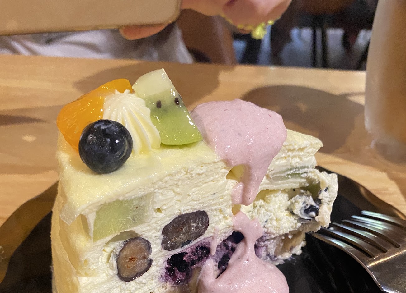 我點了新鮮水果千層蛋糕,一入口整個化開,很新鮮很好吃,但這種千層蛋糕就是奶油會很多,一人一塊,吃到最後一定會一點點膩的,但好吃是真的,坐在這裡,很多人都在取訂購的蛋糕,真的不輸某名牌?