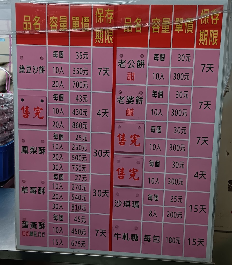 價格清楚明瞭,店員動作迅速、親切提醒保存期限,兩側櫃檯皆可服務,僅收現金、開立紙本發票。 所有產品皆為葷食,綠豆沙餅單顆份量實在、口感細緻、搭配茶或咖啡入口極佳。