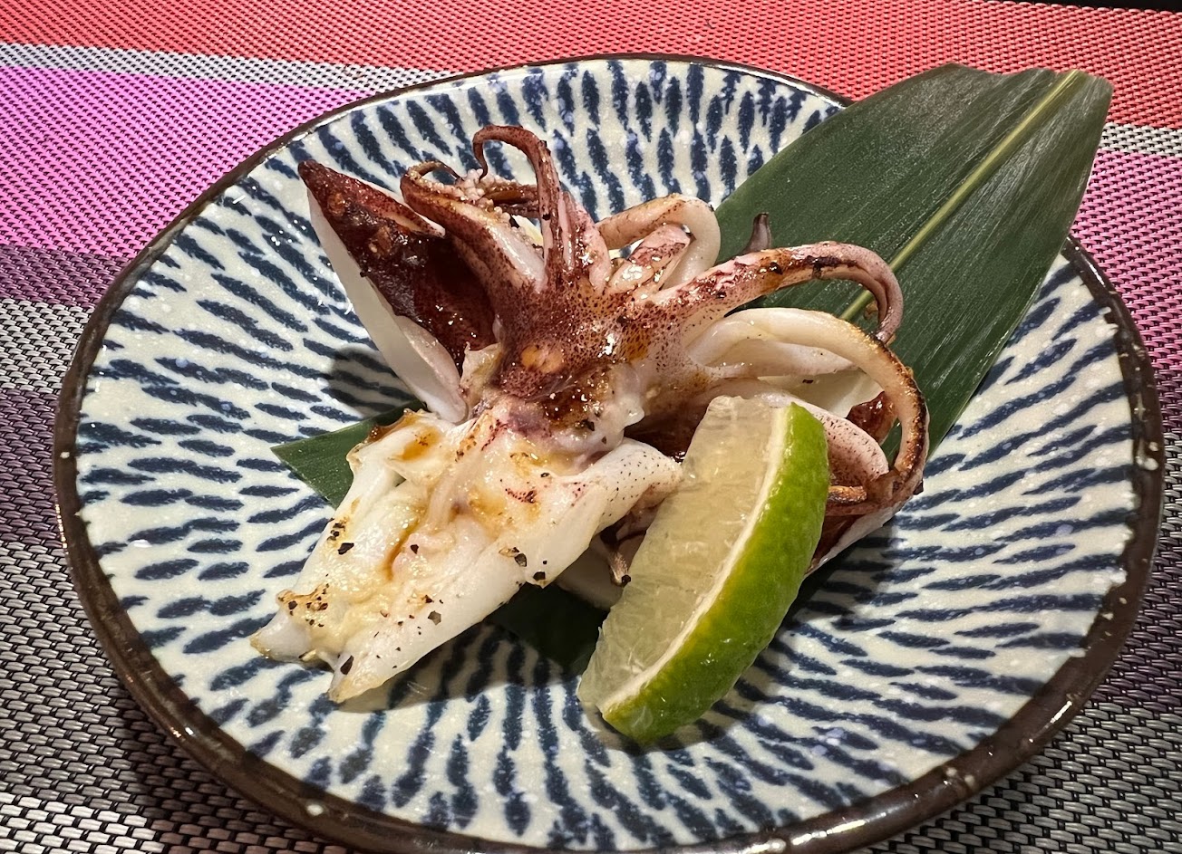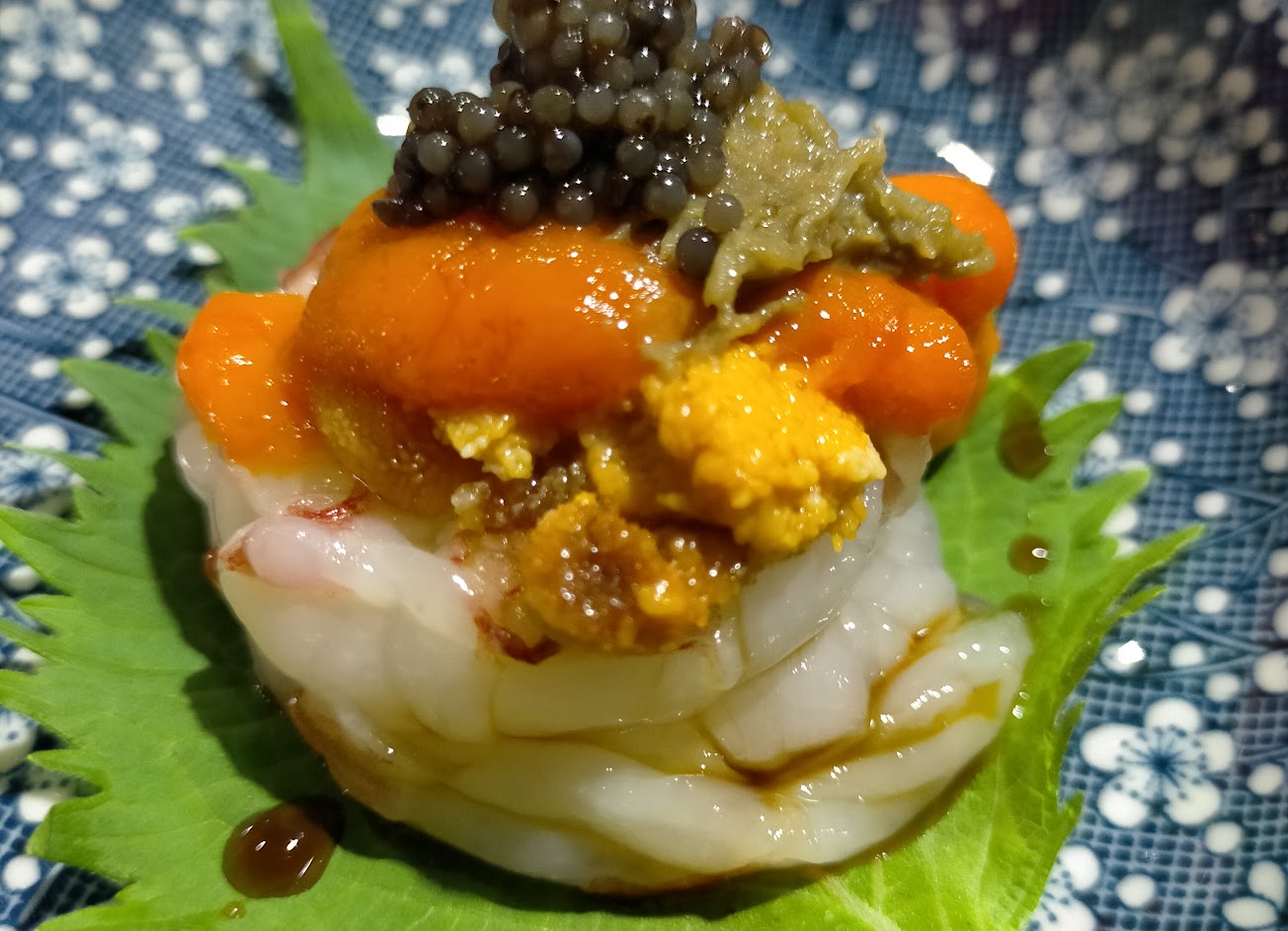 夜裡漁船才上岸的新鮮竹莢魚,肉質超級細緻,太驚豔了。 烏賊新鮮,肉肥味美,稍微醬香提味。 比起明蝦,個人更愛紅蝦,肉質更細嫩,加上一抹松葉蟹膏,天吶,大海的滋味真的在嘴裡拍打。