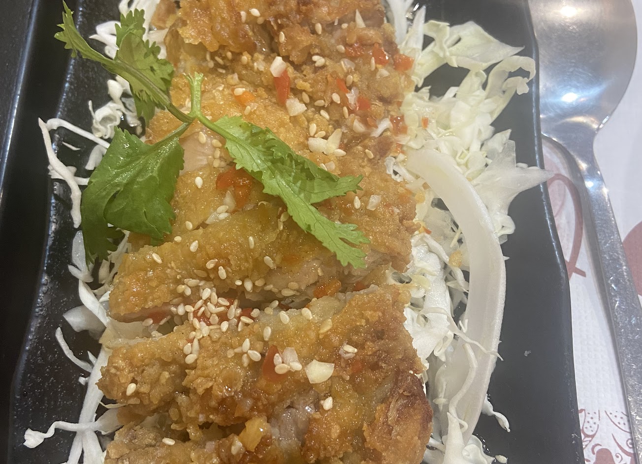 整體來說還不錯,但綠咖哩的肉沒這麼好吃,咬起來有點柴,椒麻雞皮很脆肉很嫩,點餐順序還不錯,是會想再訪的店
