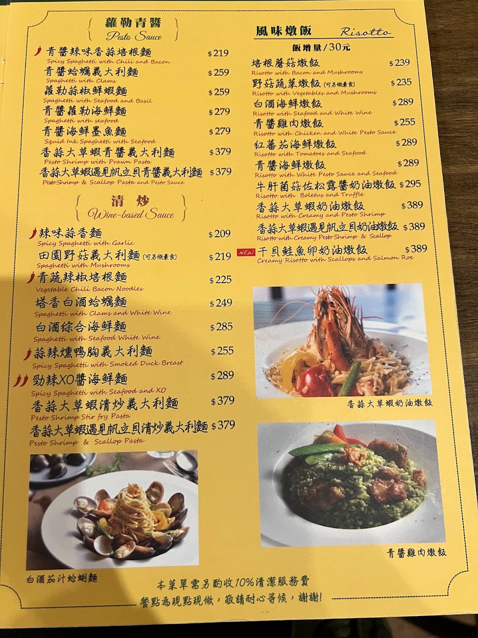 朋友聚餐選擇這間新開幕的義大利麵店 用餐環境蠻大、蠻有氣氛 當天因過年期間,用餐人潮很多 服務人員雖然不少 卻也有些顧不了這麼多人 所以點餐需要提醒服務人員 上餐速度有點慢<人多的關係 不過美味的料理都是需要耐心等候 我點的是青醬辣味培根義大利麵 口味非常豐富,醬料完全包裹在麵上 每一口都可以吃到濃濃的青醬味 雖然我覺得辣度不夠 但,這是個人口味問題 朋友們也都覺得餐點很棒 那甜點跟飲料的部分我是沒有點 但,應該算是普通套餐的搭配 整體而言我覺得很棒 唯一的缺點是…… 服務人員會看一下時間,提醒我們先結帳 <有點趕人的意思 但,至少也要給我們總金額的帳單啊啊啊啊 不然我們哪知道多少錢 而且點單的上面也沒有價格 還要自己拿價目表來算…… 有點怪????