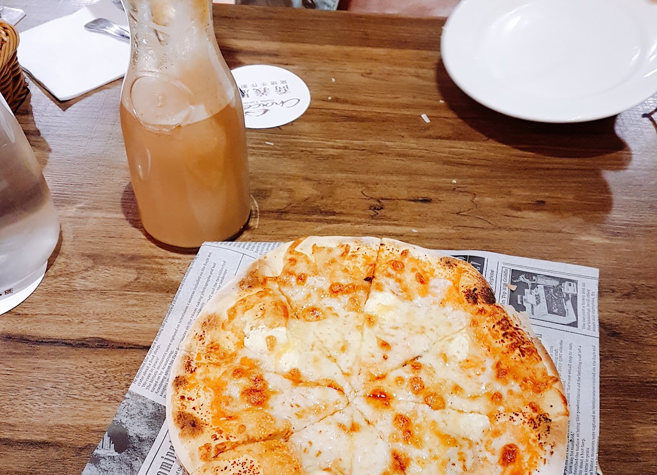 凱撒生菜沙拉的炸雞太油膩,菜種太少。明太子起士披薩不錯,明太子味淡、還好蜂蜜起士很香濃搭香脆餅皮好吃。鮮奶茶不會太甜很不錯。