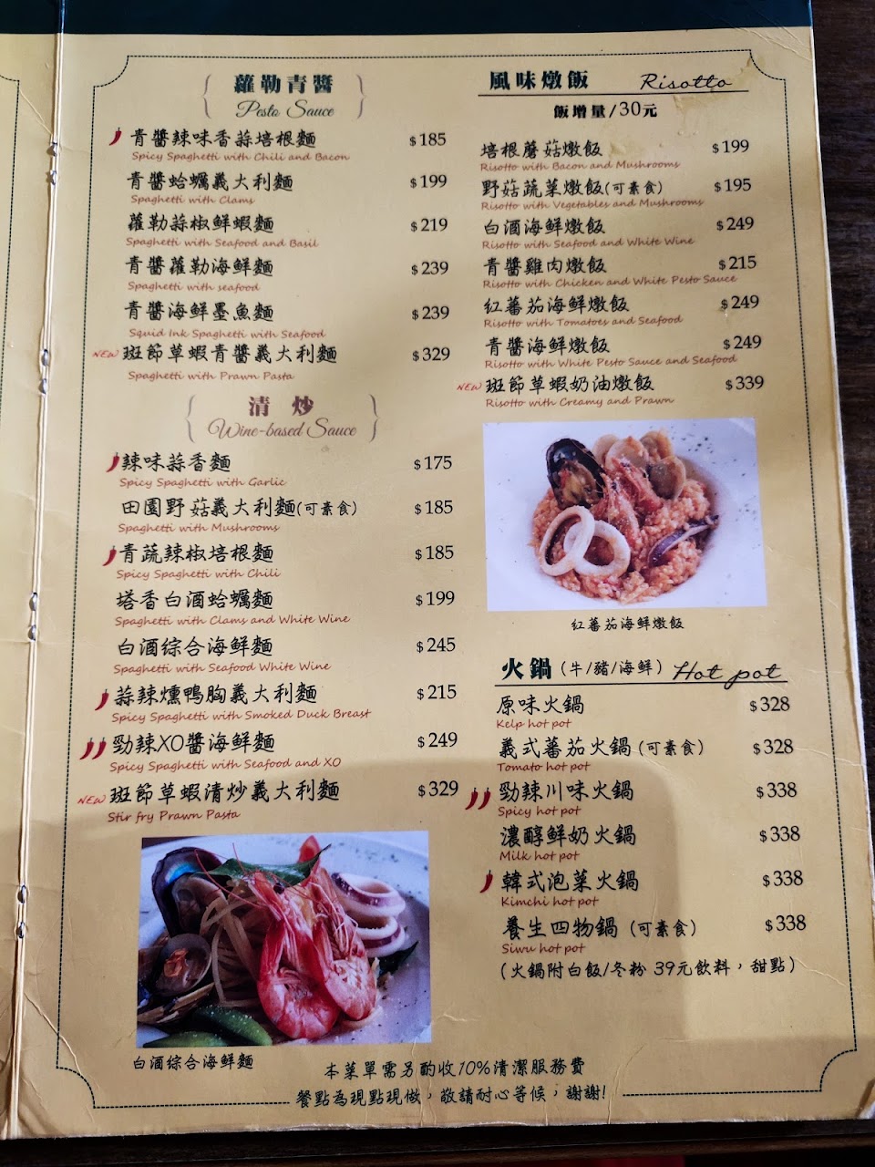 裝潢美麗,不衛生(餐具都髒的很明顯,已請服務人員更換過仍如圖片髒的超明顯,且服務人員對於客人的反應多不回應或回應的很生澀),美式咖啡不ok,義大利麵還不錯,火鍋海鮮不新鮮。 員工訓練不足,服務差,帶位、點餐基本流程不佳,這樣的服務收服務費有點不合理。 用餐時消防響鈴許久,服務人員皆無動作或說明,詢問下才回應已致電詢問仍不清楚狀況,並說明由於剛開業因此也是第一次遇到,對於狀況不了解,而後有消防人員到場巡視。
