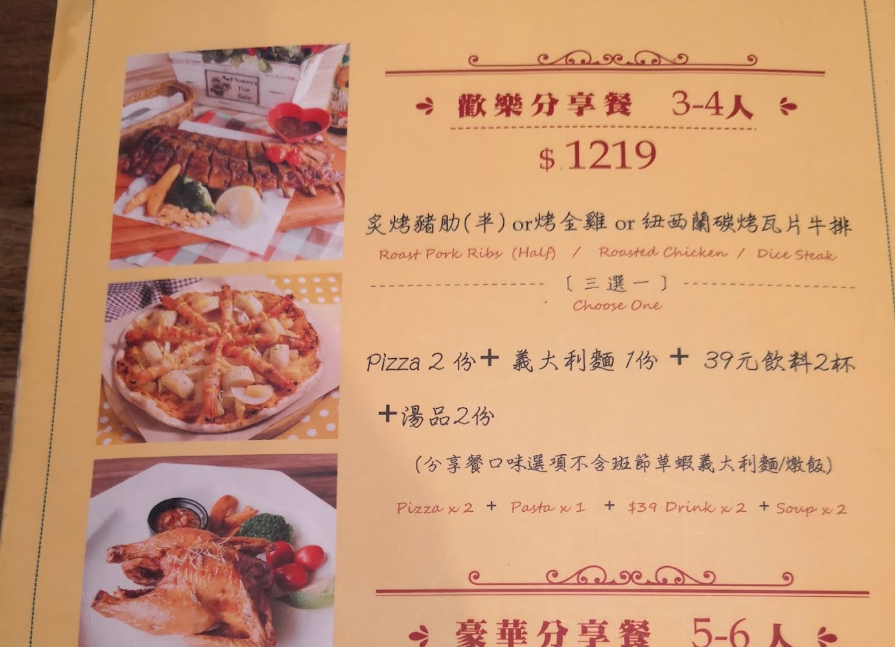 平均一人消費300。 點3-4人套餐很划算。肯定吃不完… 一隻雞!兩盤披薩!一份義大利麵!兩個湯!兩個飲品!這樣的組合要4個男生才有辦法了! 烤雞超好吃!好嫩味道好夠味..他的醬料好好的。 薄片披薩,熱熱吃好好吃,皮脆脆的!好美味! 唯一就是飲料比較普通。適合家人一起來用餐喔!