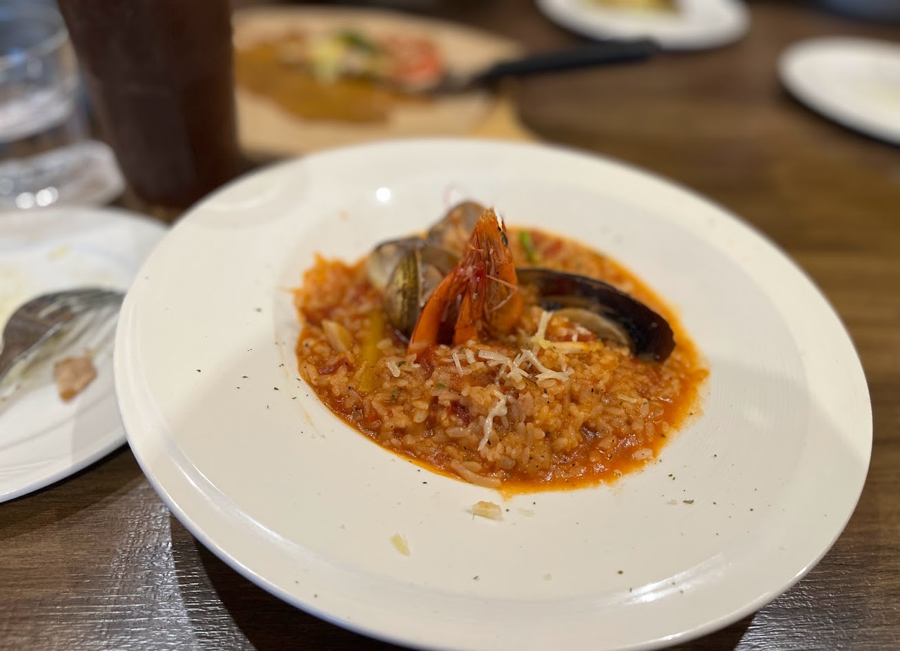 餐點的部分,多數同行友人都覺得一般,義大利麵口感和味道算中規中矩,寬扁麵朋友覺得還不錯。 燉飯的部分,因為個人比較喜愛湯汁能夠收進去飯裡的方式,今天點的紅蕃茄海鮮燉飯其實還是有一些些的湯水,但並不會太多,味道其實還可以,是有一點偏酸的料理但我能接受。 朋友同時吃了我的紅蕃茄海鮮燉飯和他的青醬海鮮燉飯,他更喜歡他的青醬,或許是他不愛酸?。