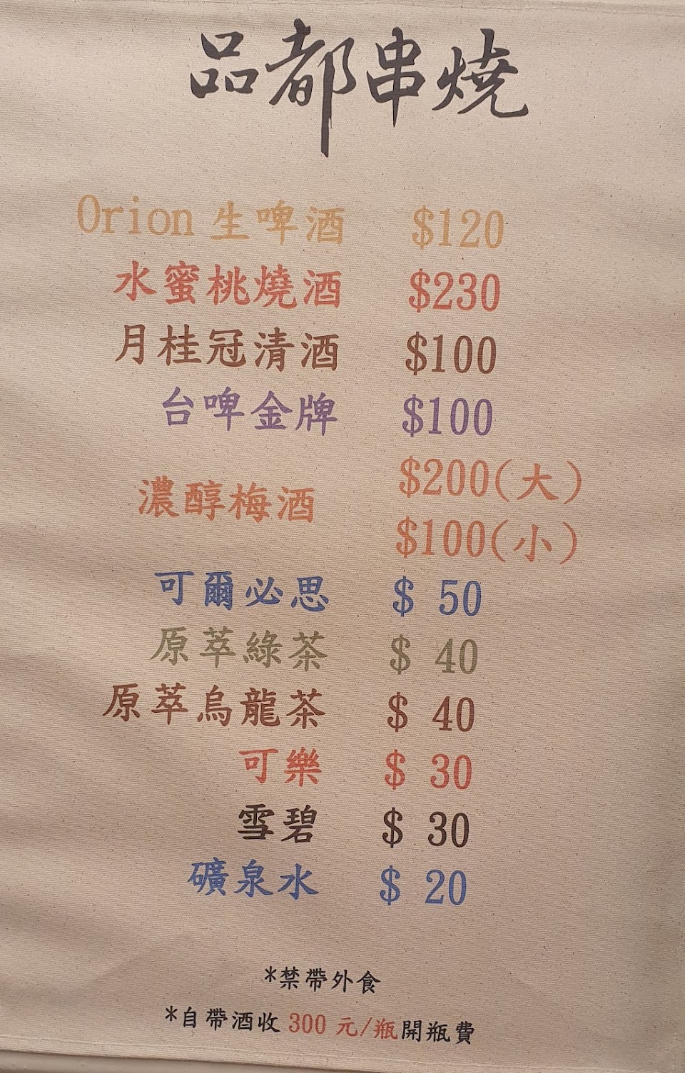 店內禁帶外食,若需喝飲料店員會詢問是否購買瓶裝水或是酒類。串烤調味得宜,搭配啤酒更是美味無比!