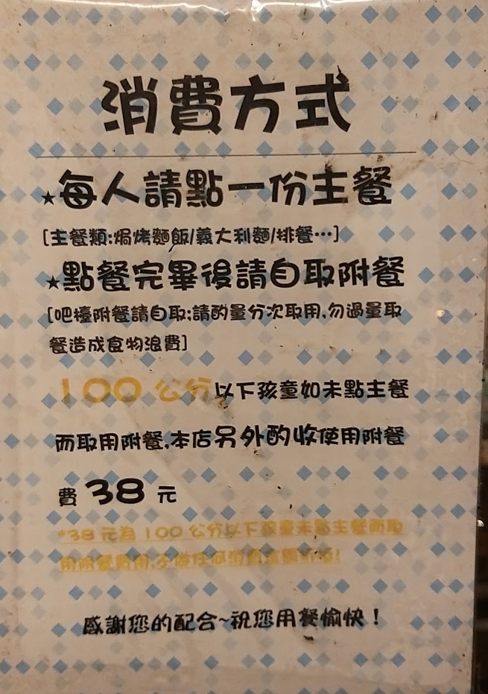 平價義大麵及排餐,飲料需另外加價,但點主餐就有附喝到飽的濃湯及甜湯。口味算不錯,薯條也好吃,但主餐的份量有點少,一二年前拜訪時份量都還可接受,但這次一行人到訪,每個人點一份主餐另加二份薯條分食,但大家都沒有飽足感。