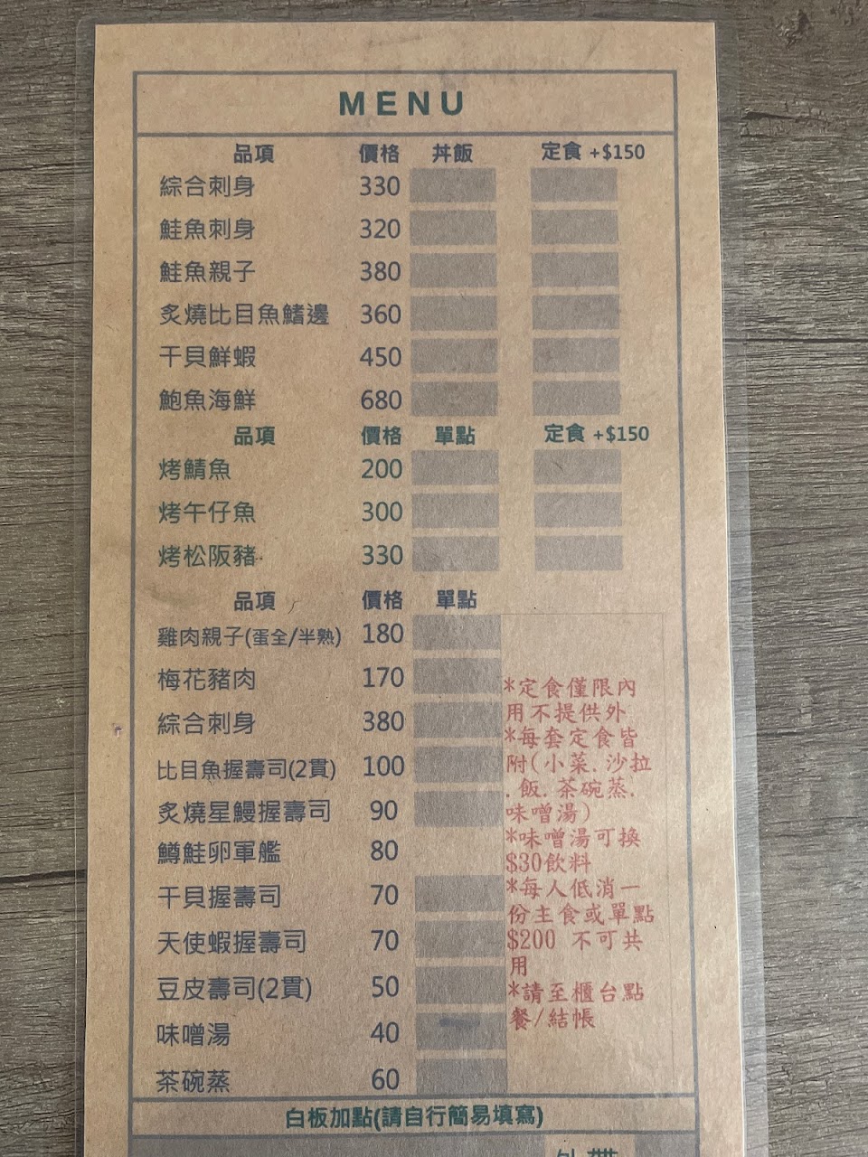 因為店面座位不是很多所以最好事先要訂位,很幸運剛好還有一組客人尚位到所以老闆娘就讓我們進去用餐。因為第一次來嚐鮮所以就點了店內有趣的菜單”看心情握壽司”和其它餐點;不愧是谷歌評價很高的日式食堂,生魚片應該是有經過老闆的挑選,直接吃入口感覺很滑順而且幾乎沒有魚筋的問題;另外茶碗蒸個人覺得很推薦,蒸蛋與高湯的結合會讓人想再來一碗。