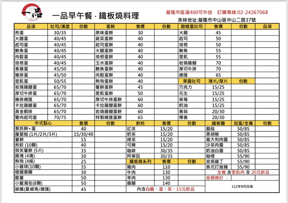 2024最新在地推薦餐廳的菜單_一品早午餐 鐵板燒料理的菜單、圖片
