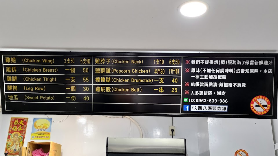 西八碼頭生意很好,好像不管什麼時候都會排隊,人多人少而已,大家每樣炸物都是好幾百好幾百的買,然後工作人員忙到很厭世,常常會有幾項炸物區都空空的被賣光光,不過還是會看有什麼可以買就買什麼,買完整車都是滿滿的炸雞香氣…XD