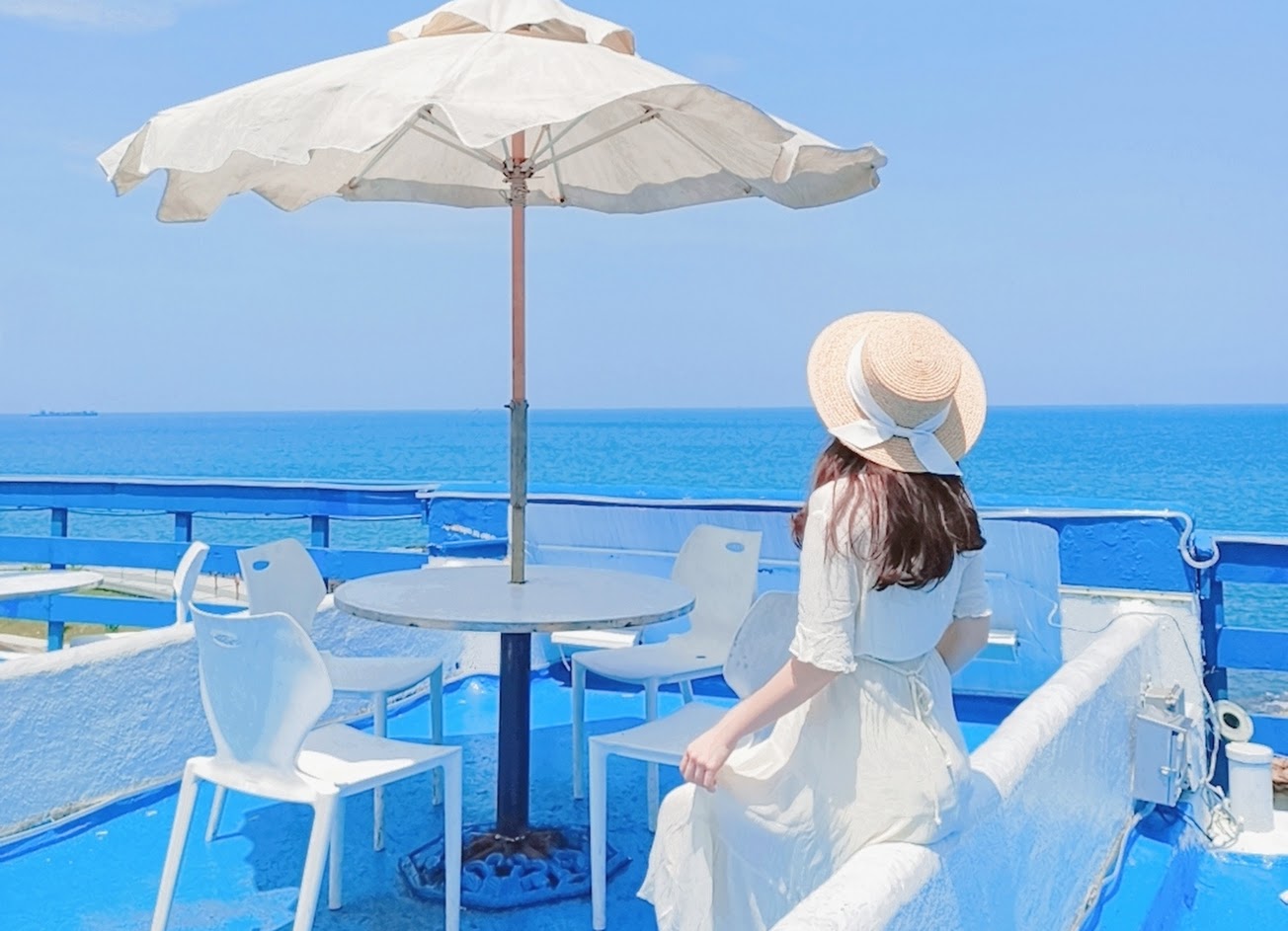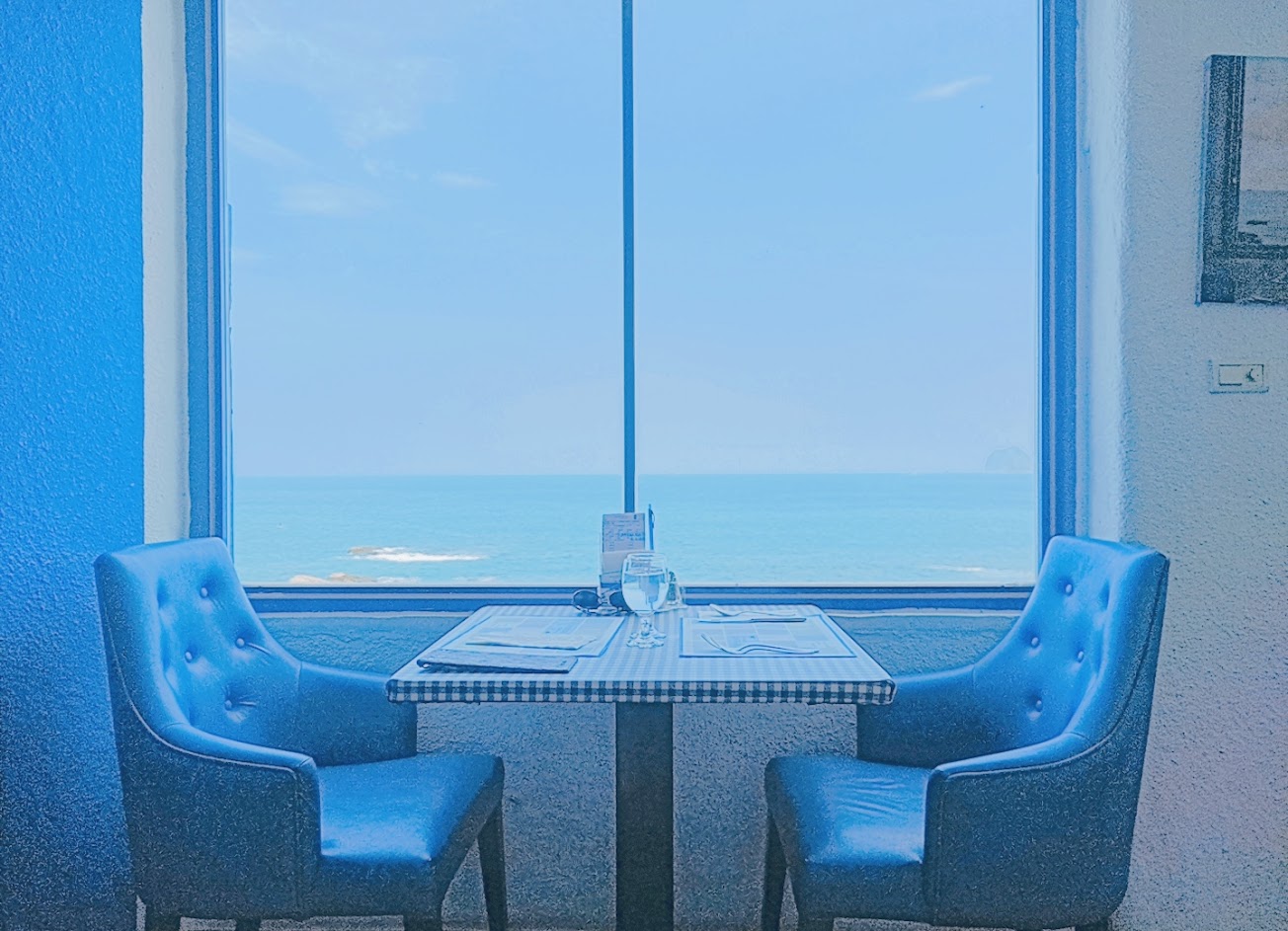 建築搭配了藍白相間的配色,與周遭的房舍相比,特別引人注目,加上絕佳的海岸景觀,假日時常常是高朋滿座,坐在三樓的窗邊,一邊用餐一邊觀賞窗外美景,整體感覺不錯。