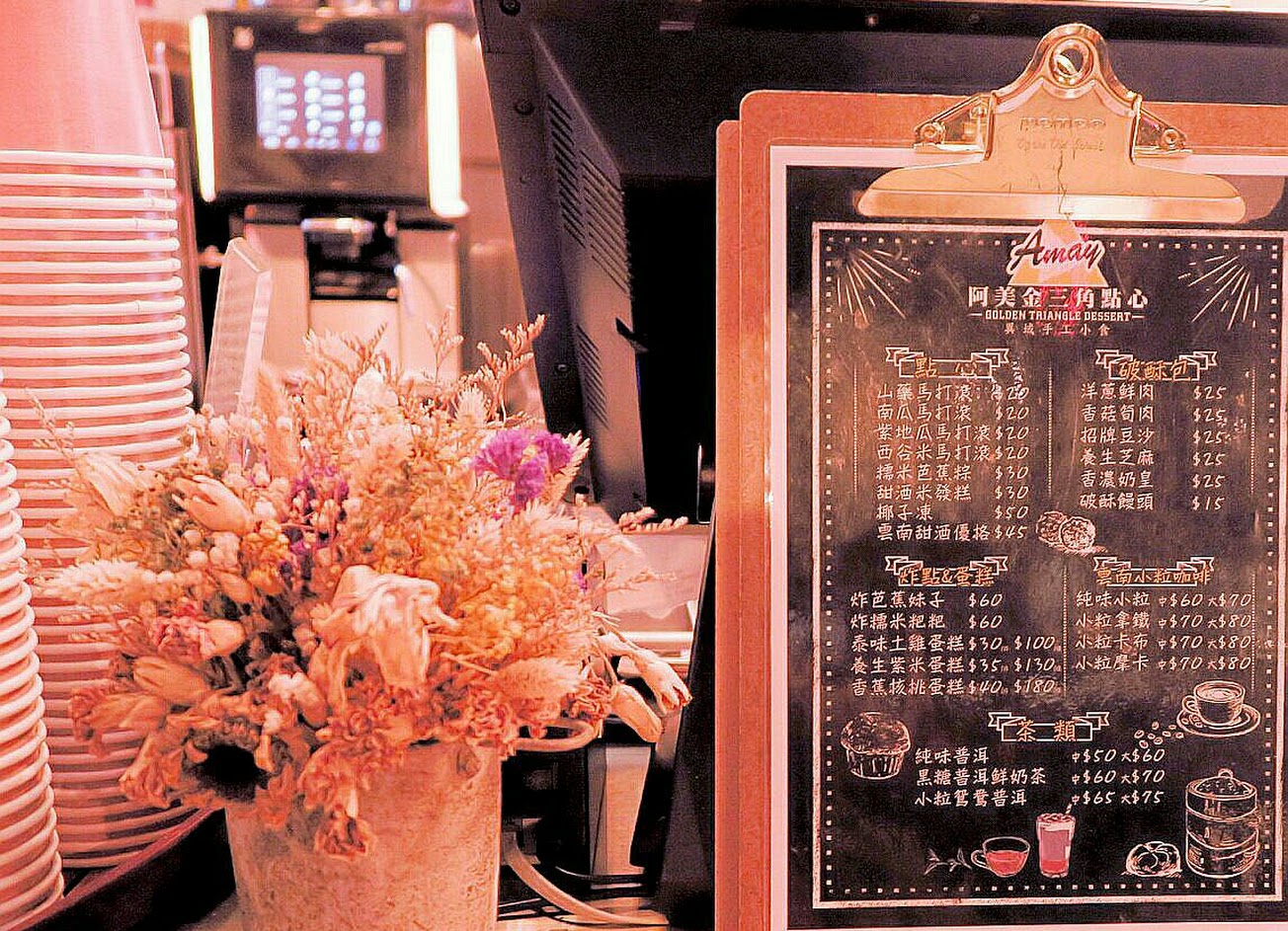 網海資料 : 阿美金三角點心店是阿美米干附設的輕食餐廳,也是忠貞商圈內唯一的一間點心專賣店,工業風的裝潢設計伴隨著咖啡和茶的香氣,透出慢活的悠閒氛圍,櫥窗內豐富的滇、泰點心彷彿在訴說流浪的故事,牆上滿滿的孤軍珍貴照片讓人彷若閱讀了一段被遺忘的歷史。開放式的破酥包工作室可以欣賞到破酥包繁複的製作工藝,同時也看得見食材的新鮮和安心。