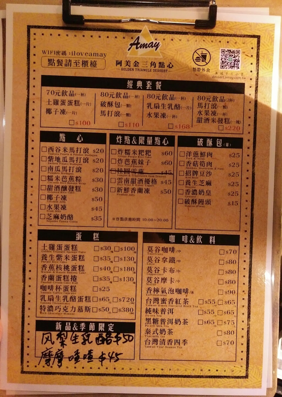 阿美集團開的點心店,販售破酥包、炸芭蕉妹子、泰北紅茶奶茶、鴛鴦普洱等等點心及飲品。價位親切且餐點也好吃,有時會買冰櫃裡的甜酒釀優格當點心吃解解膩,個人最愛的是泰北奶茶,冰的熱的都很好喝,去外面其他手搖飲店都找不到類似的味道。小粒鴛鴦拿鐵等咖啡飲品也不錯,但只有中杯。破酥包有接宅配訂單,也是此店的熱門商品。下午茶點心推薦土雞蛋蛋糕或是香蕉核桃蛋糕,兩款蛋糕都有販售單塊(40元)或一整條(100-120元)。甜酒釀發糕也不錯,都是很扎實的高點。推薦!