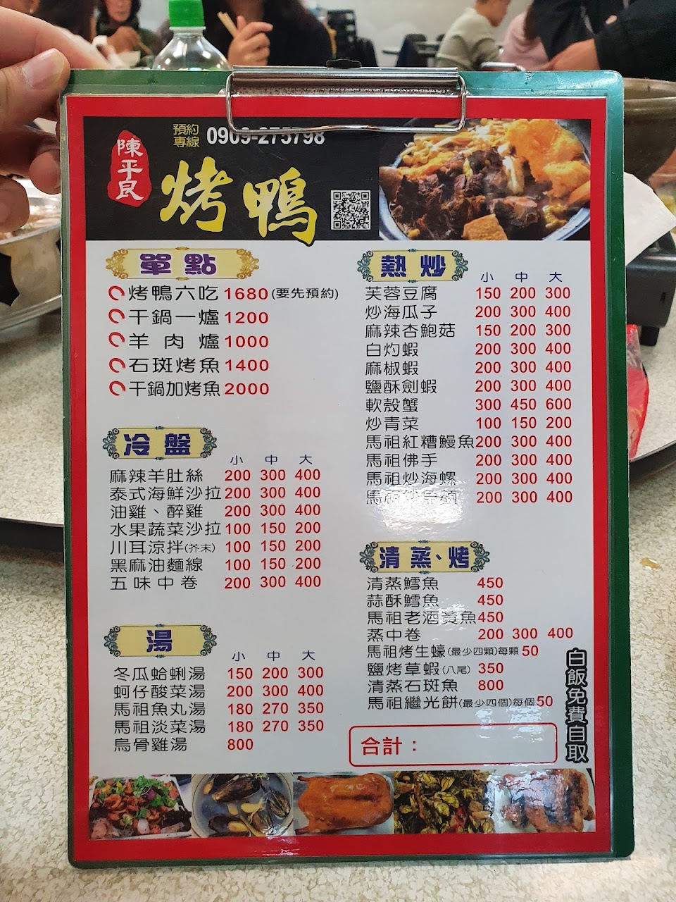 烤繼光餅 麻油麵線 蚵仔煎蛋 馬祖淡菜湯 一鴨五吃 羊肉爐及火鍋料 海鮮干鍋 炒鴨架