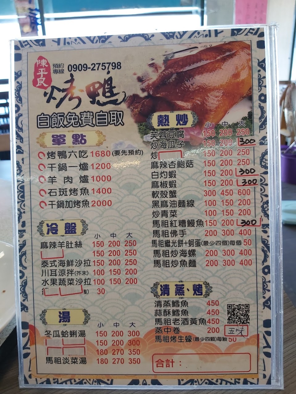 烤繼光餅 麻油麵線 蚵仔煎蛋 馬祖淡菜湯 一鴨五吃 羊肉爐及火鍋料 海鮮干鍋 炒鴨架