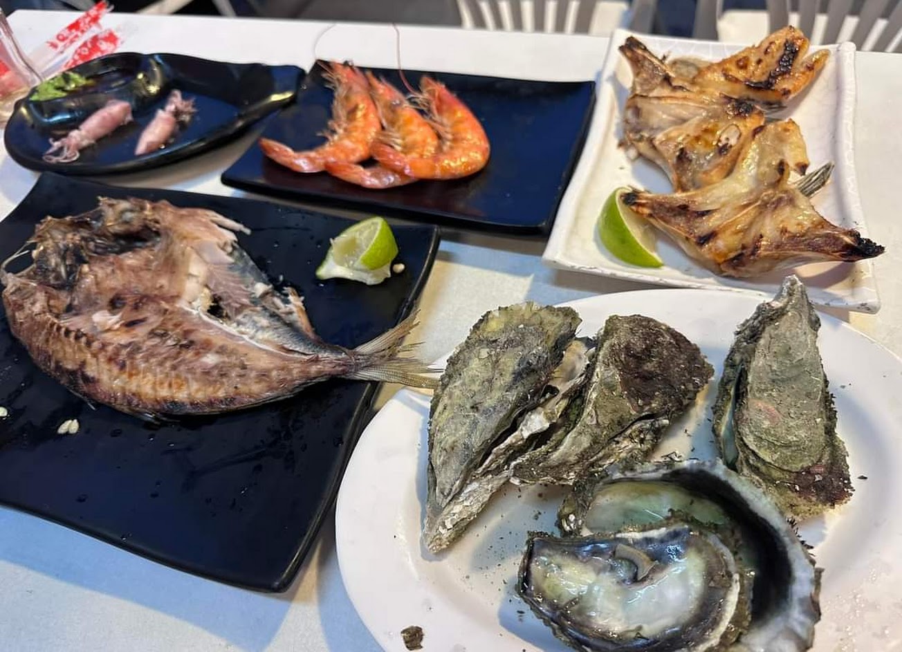 店面雖然沒有隔壁另一家店豪華,但東西真的新鮮,價格合理,等不了菜到起齊才拍照,邊吃邊拍,不是很完整,但這5道菜只花了620元,真的是佛心價,蝦是5隻,左上那是滿滿1盤,生蠔4顆,竹夾魚是完整1隻,沒點飯,這裡除了海鮮,還有肉串,牛排等,牆上都有實物照片跟價格可參考,別擔心受騙或點錯,偷偷聽闆娘說,只要不下雨,幾乎都開門做生意,推薦給大家,值得去用餐!