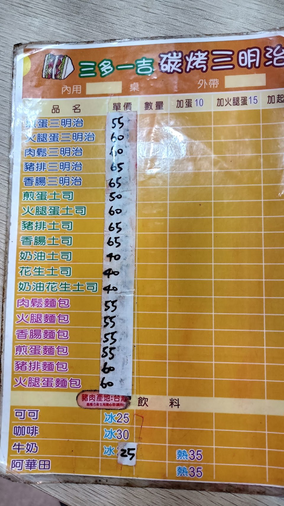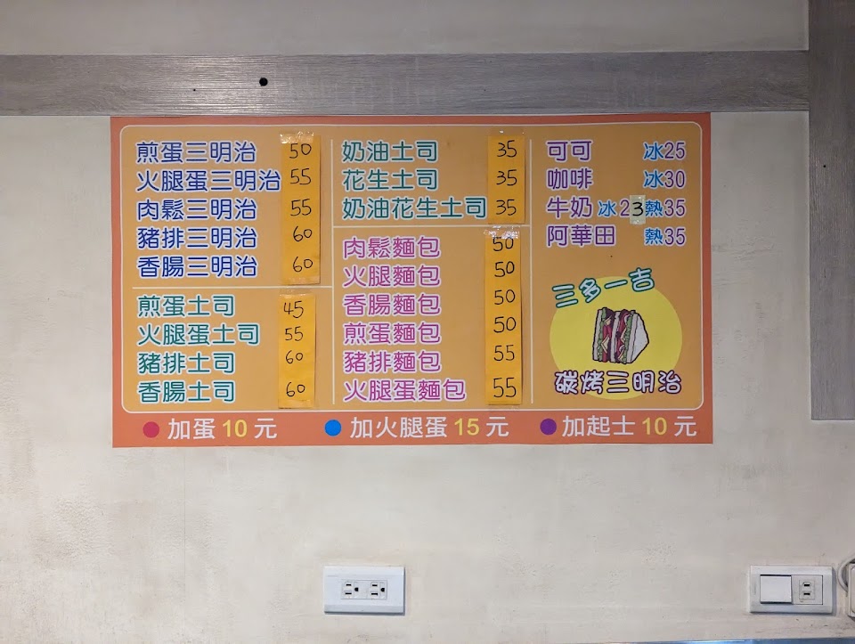 地方整齊 乾淨 三明治我吃起來 也蠻好吃的 服務 內用 餐點類型 早餐 平均每人消費金額 $1-200 餐點:5 服務:5 氣氛:5 建議的餐點 可可亞 &火腿三明治 豬排蛋三明治