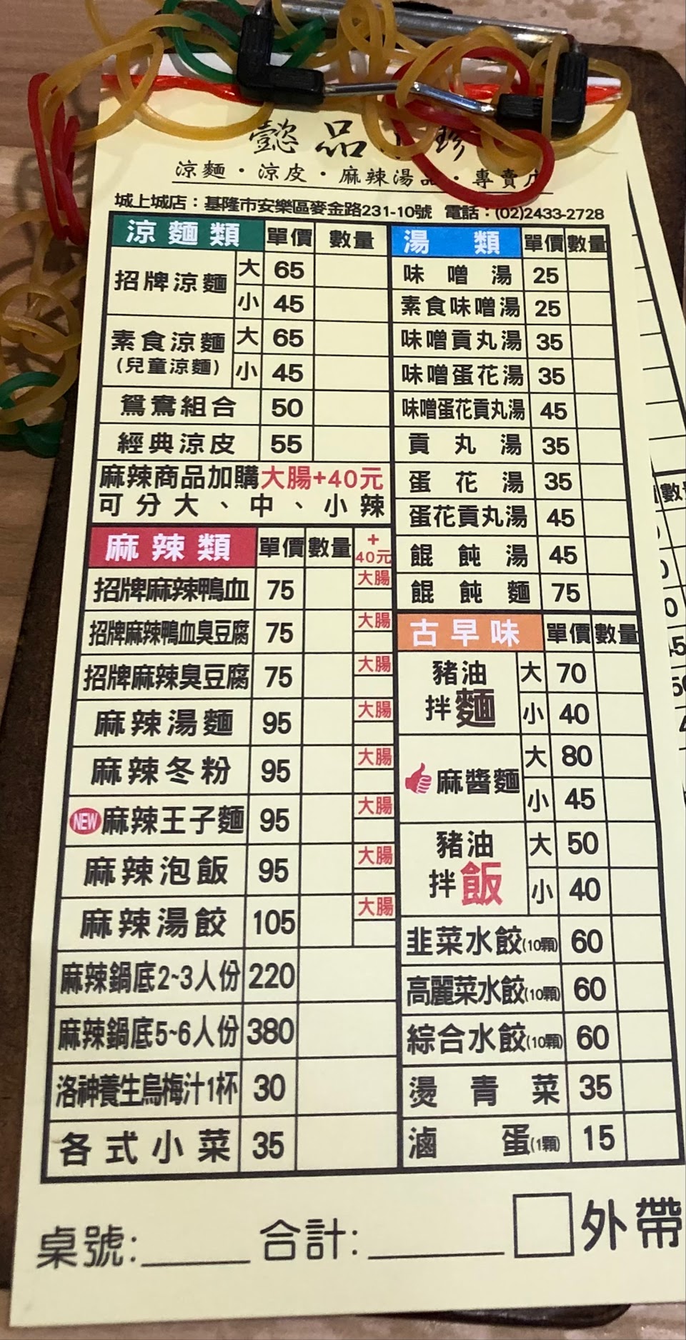 涼麵、麻辣鴨血、味噌湯、水餃都好吃。 服務 外帶 餐點類型 晚餐 平均每人消費金額 $1-200