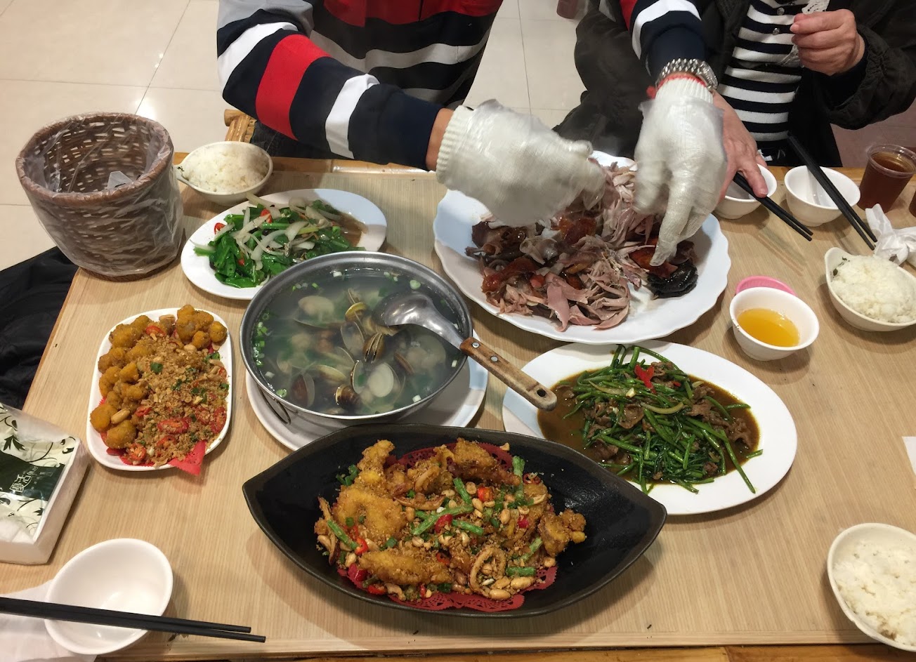 不知為何雞肉口感不是很優,肉質柴柴的,其他菜色也一般,珠蔥理應很細嫩,卻是很粗曠,店員說是改良新品種,或許是自己孤陋寡聞吧。白飯需付費,1碗10元,桌菜吃完要打包時,便當盒1個也要10元,應該是老闆的美意,鼓勵不要浪費食物,盡量全部吃完吧??? …